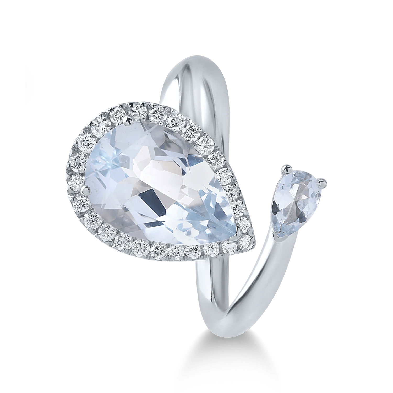Acest inel din aur alb îmbină eleganța și originalitatea, având acvamarine de 2.89ct, tăiate în formă de pară, și diamante de 0.24ct. Acvamarinele aduc o notă de prospețime oricărei ținute.