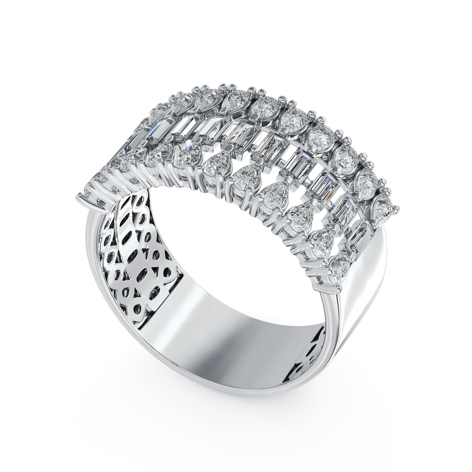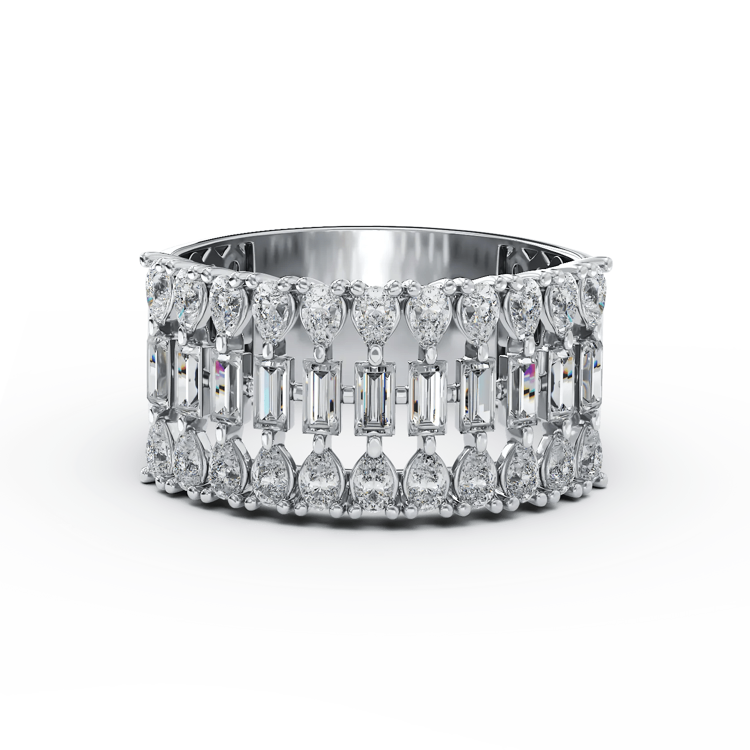 Bijuteriile au puterea de a reflecta personalitatea ta. Acest inel din aur alb cu diamante baguette și pear de 1.77ct îmbină originalitatea cu rafinamentul, subliniind elegant farmecul tău. Designul său fluid, împreună cu taieturile sofisticate, adaugă o notă de modernitate, iar strălucirea diamantelor evidențiază feminitatea în cea mai pură formă. O piesă care te încurajează să fii autentică și să strălucești în fiecare moment.