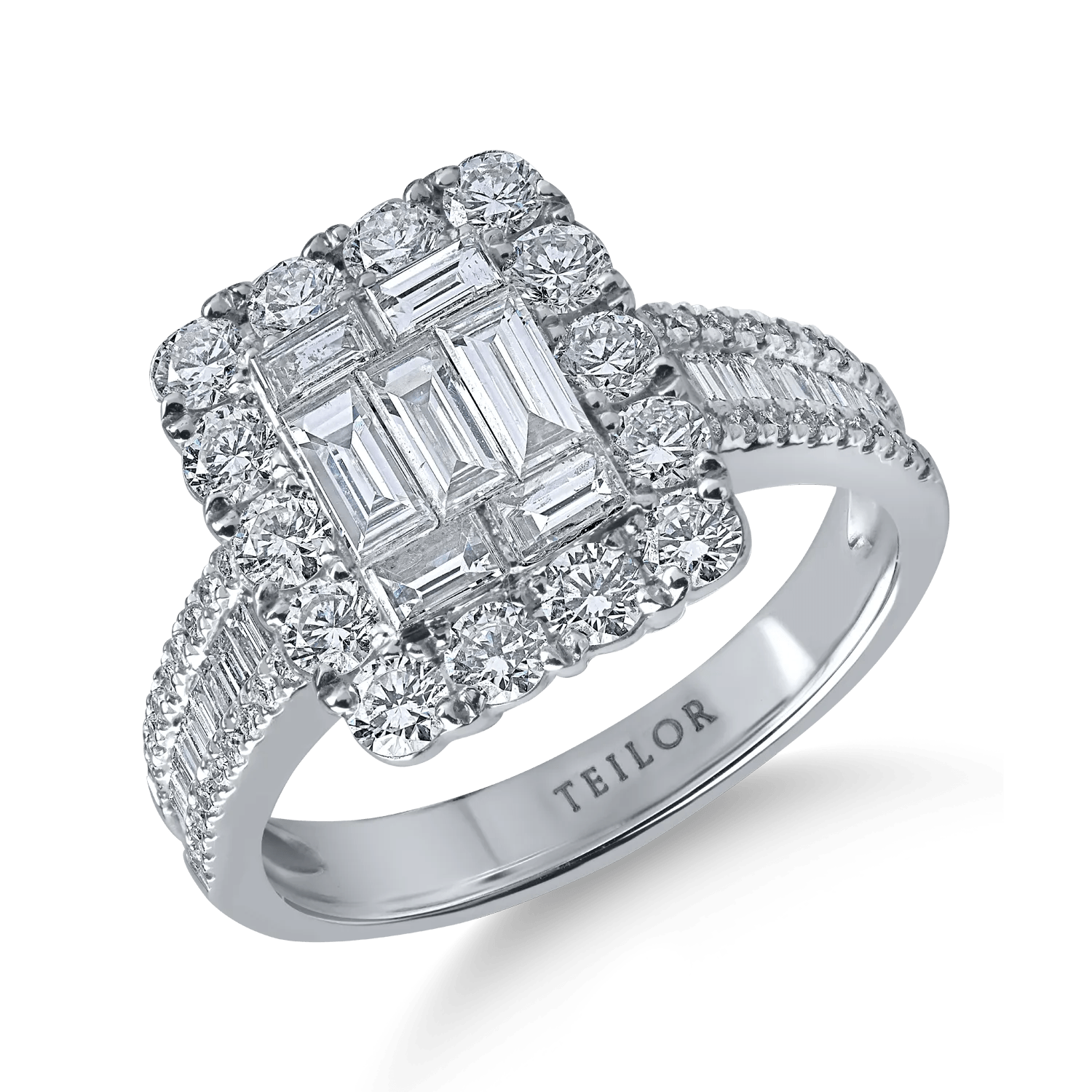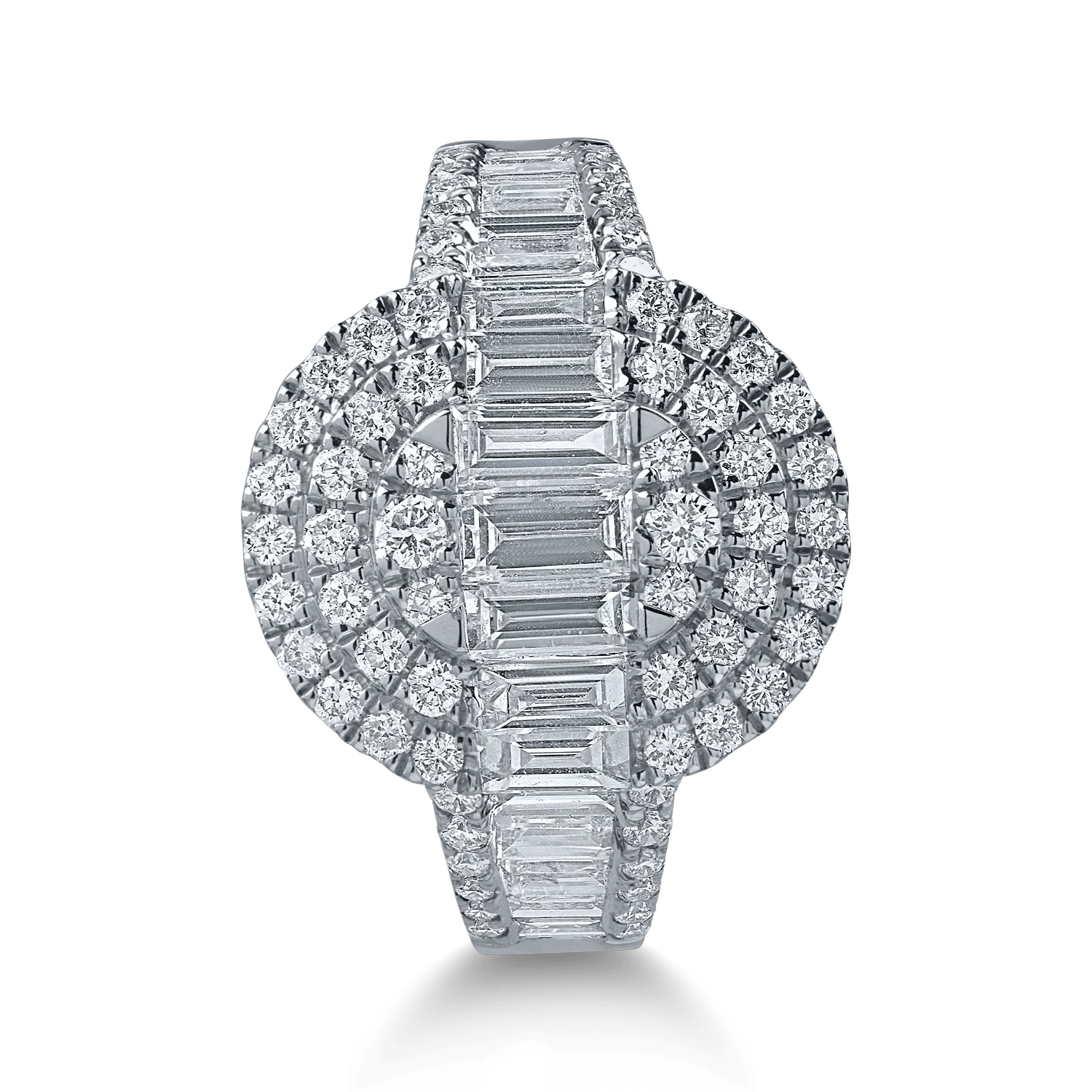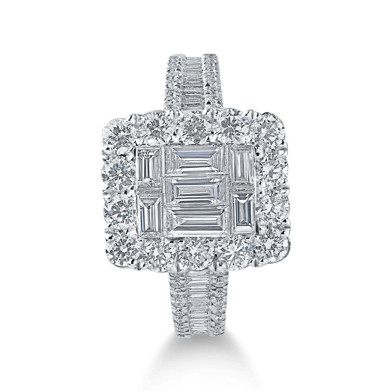 Acest inel din aur alb, înfrumusețat cu diamante baguette și rotunde de 1.6ct, emană eleganță și rafinament. Designul său minimalist subliniază strălucirea fiecărui diamant așezat cu grijă pentru un efect vizual spectaculos.