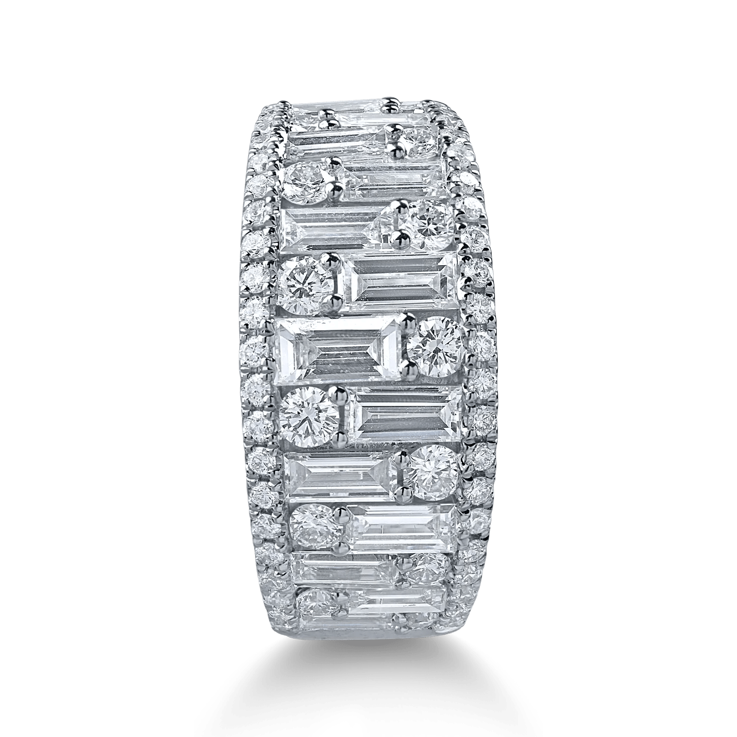 Acest inel din aur alb îmbină diamantele baguette și rotunde, totalizând 2 carate, creând o piesă de eleganță sofisticată. Reflexiile oferite de tăieturile moderne și clasice ale diamantelor adaugă un efect de lumină captivant și echilibrat. Aurul alb subliniază frumusețea și strălucirea atemporală a acestei bijuterii.