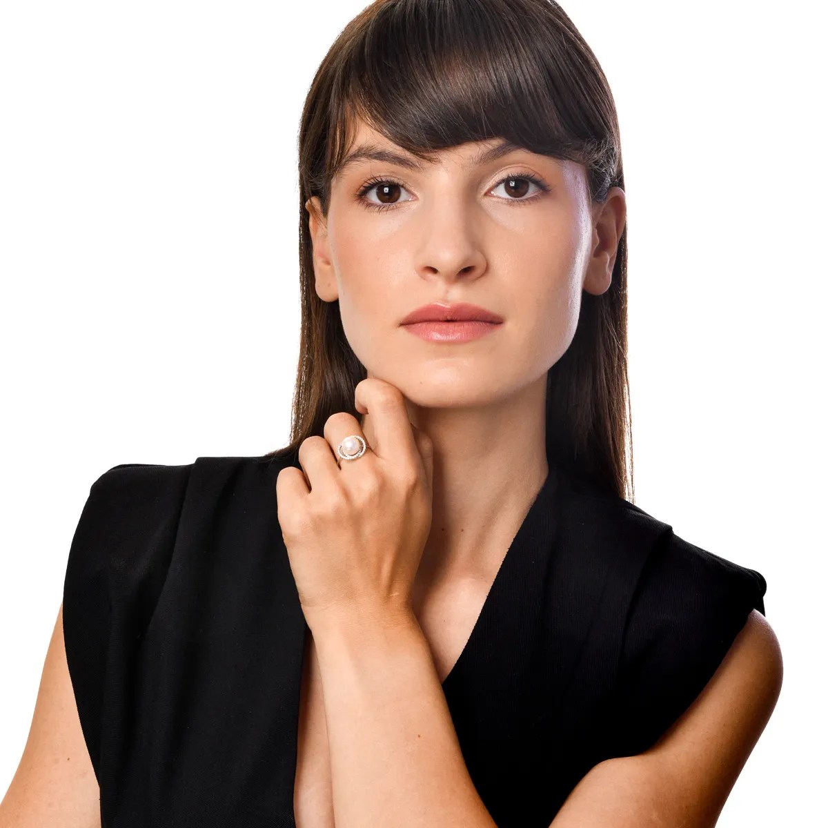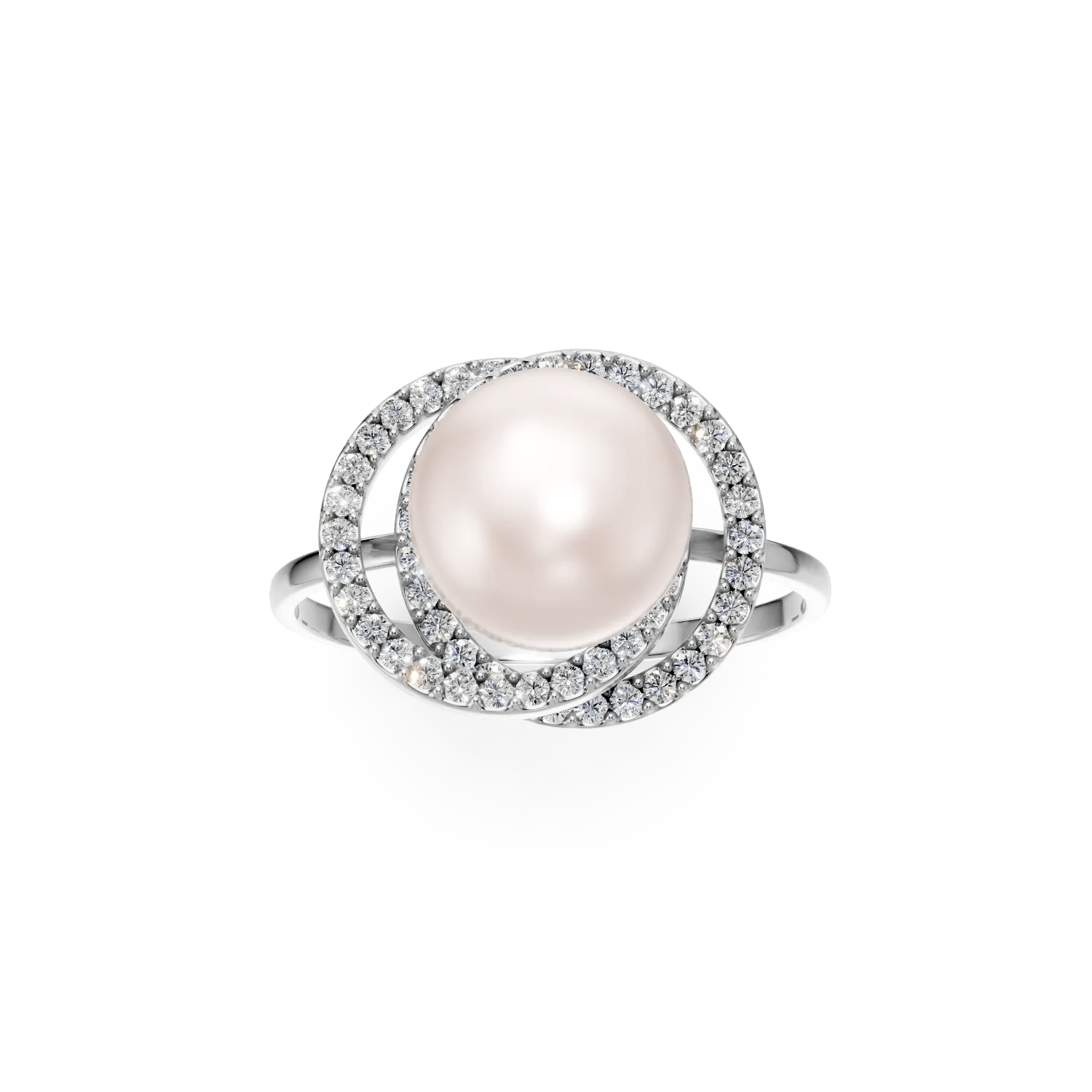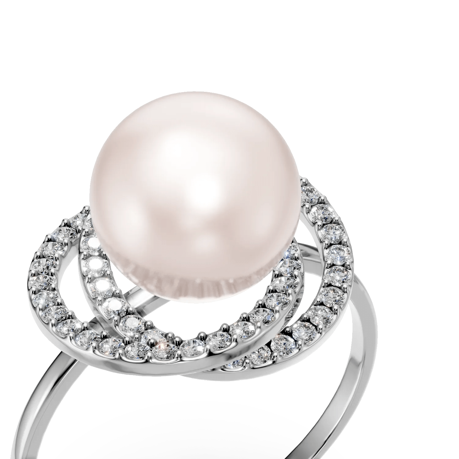 Acest inel rafinat din aur alb, cu perlă sintetică și zirconii, aduce o notă de originalitate și eleganță. Poartă-l și lasă farmecul său unic să-ți pună în valoare feminitatea.