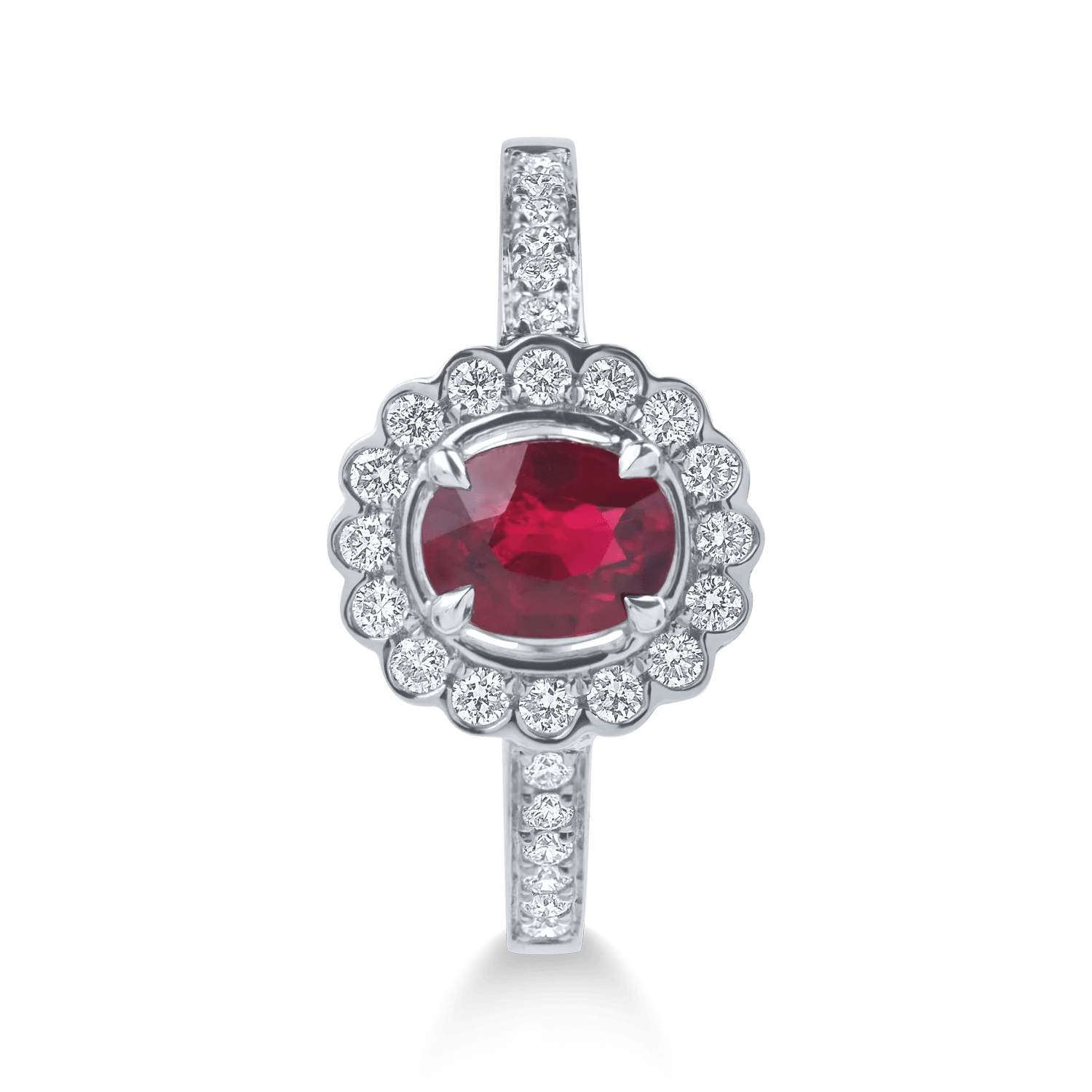 Acest inel din aur alb, decorat cu un rubin oval şi diamante de 1ct, aduce o notă de stil fiecărei ţinute. Strălucirea rubinului, în armonie cu diamantele, creează un contrast elegant. Detaliile rafinate evidenţiază eleganţa şi rafinamentul acestei bijuterii.