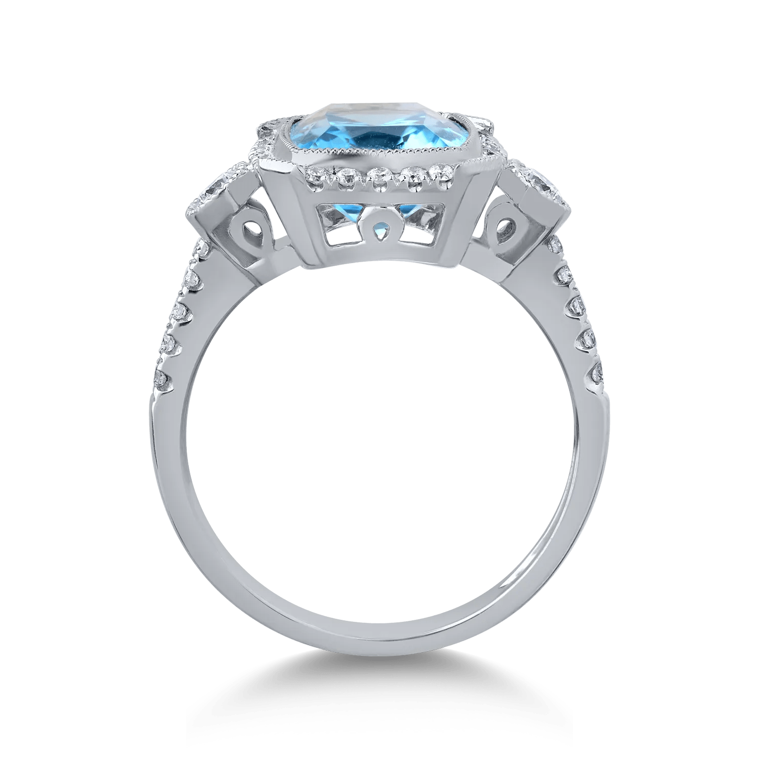 Alege rafinamentul cu acest inel sofisticat din aur alb, care îmbină un topaz albastru cu tăietură cushion de 4ct și diamante fine de 0.3ct. Designul său modern evidențiază contrastele delicate dintre nuanțele cerului și strălucirea discretă a diamantelor laterale.