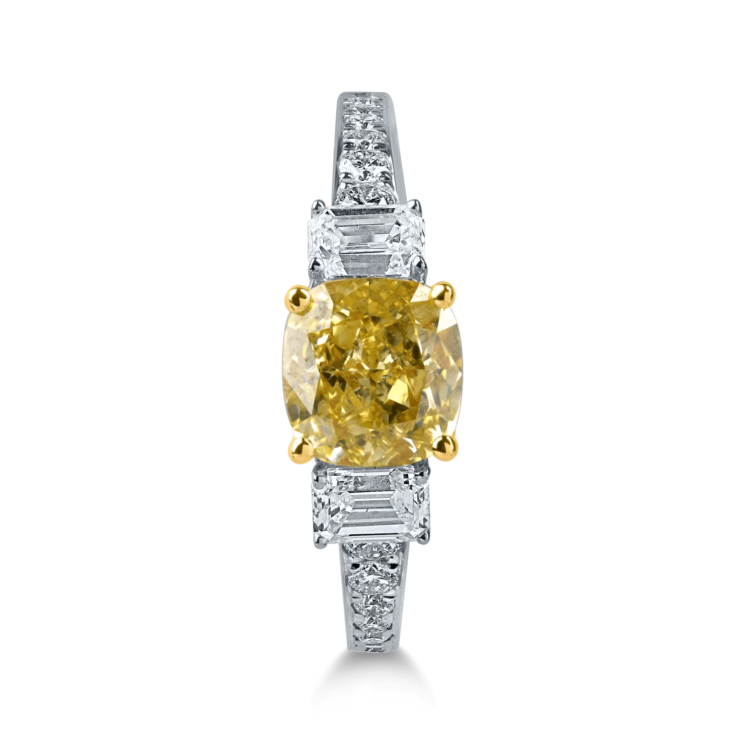 Inelul din aur alb-galben prezintă un diamant fancy galben de 1.5ct, alături de diamante incolore de 0.7ct, oferind o strălucire armonioasă. Eleganța discretă se îmbină cu un stil rafinat, perfect pentru a atrage priviri.