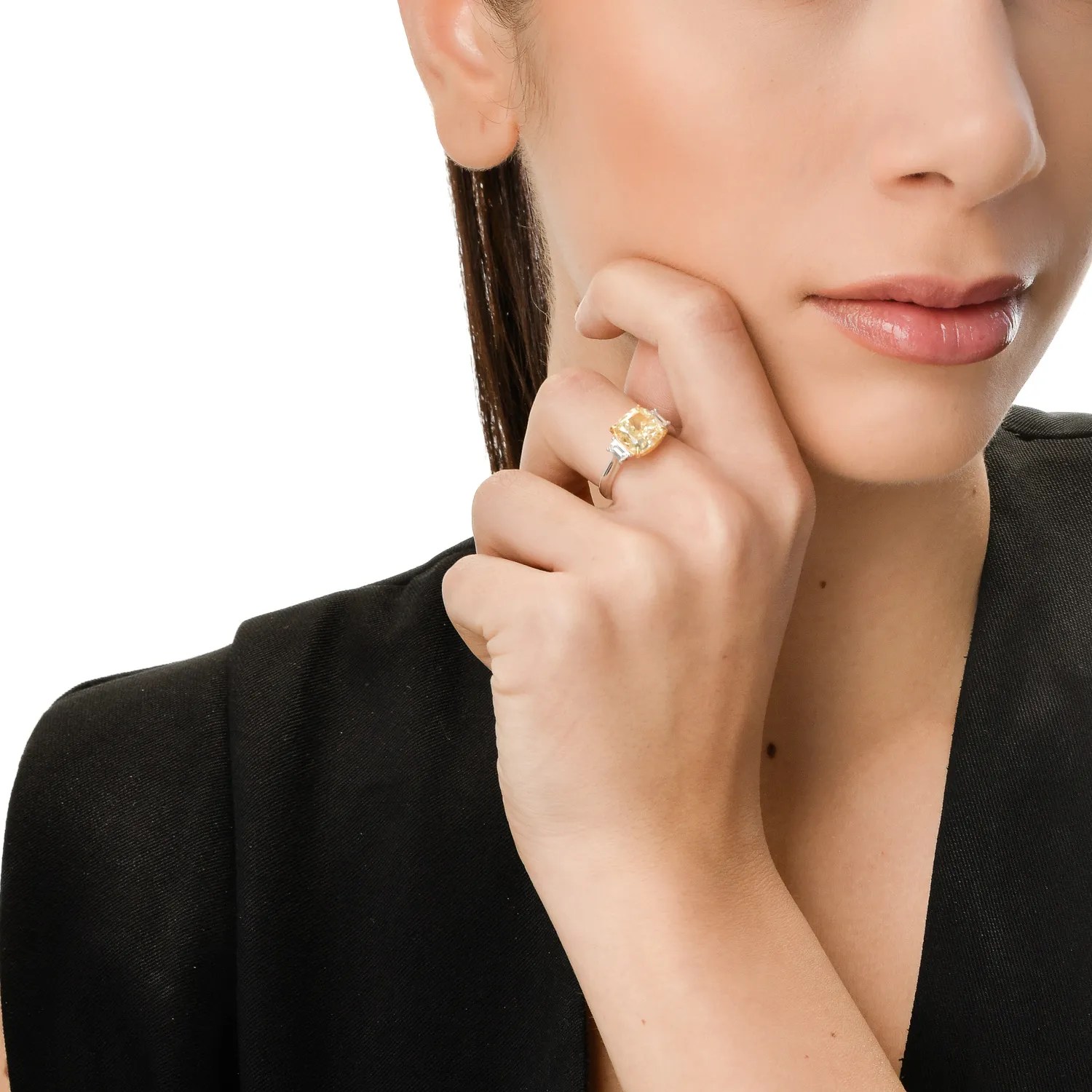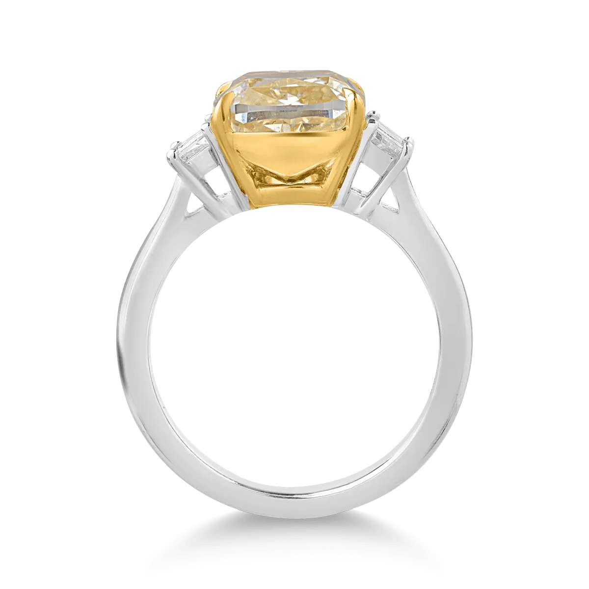 Inelul de logodnă din aur alb-galben, cu un diamant galben de 5.03ct tăiat cushion, completează eleganța finisajului. Diamante de 0.43ct adaugă strălucire suplimentară.