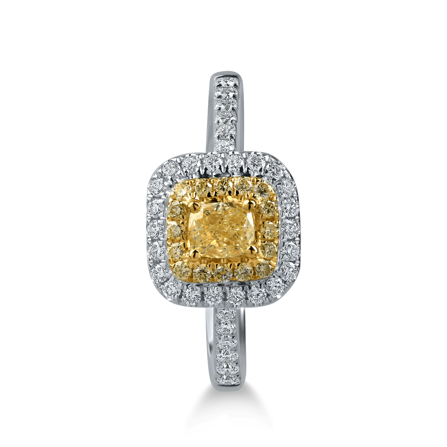 Diamantele galbene cu tăietură cushion adaugă profunzime, iar pietrele rotunde incolore asigură un joc de lumini echilibrat.