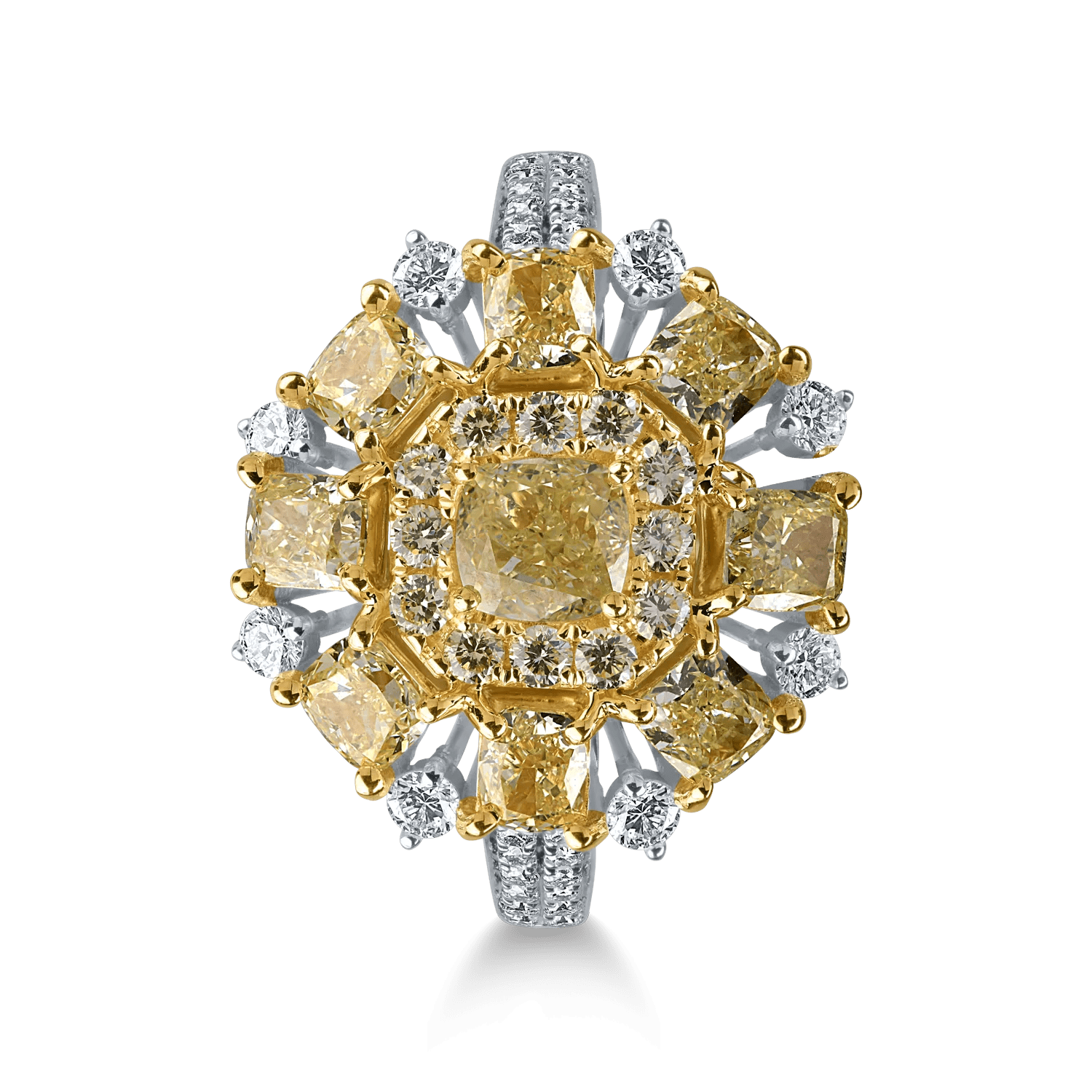 Acest inel din aur alb-galben emană eleganță și distincție. Cu diamante galbene, atât rectangulare, cât și rotunde, alături de pietre incolore de 2.8ct, acest accesoriu atrage prin combinația sa de nuanțe și tăieturi. Diamantele rectangulare oferă profunzime, iar cele rotunde completează ansamblul cu o strălucire armonioasă. Este alegerea ideală pentru evenimente unde eleganța și originalitatea sunt esențiale.
