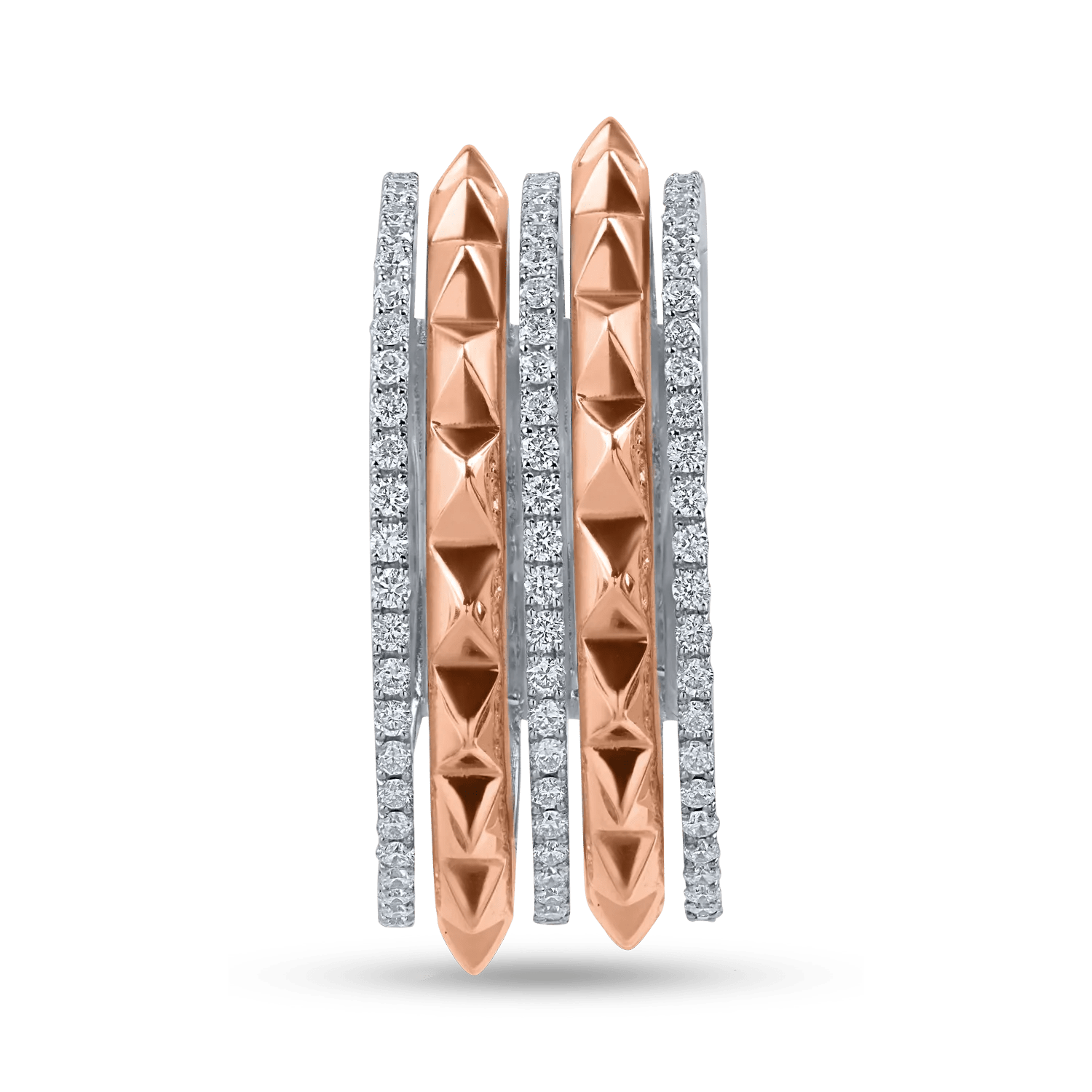 Acest inel captivant din aur alb-roz este împodobit cu diamante de 0.4ct, tăiate în formă baguette. Dispunerea sofisticată și arhitecturală a pietrelor evidențiază eleganța și minimalismul designului.