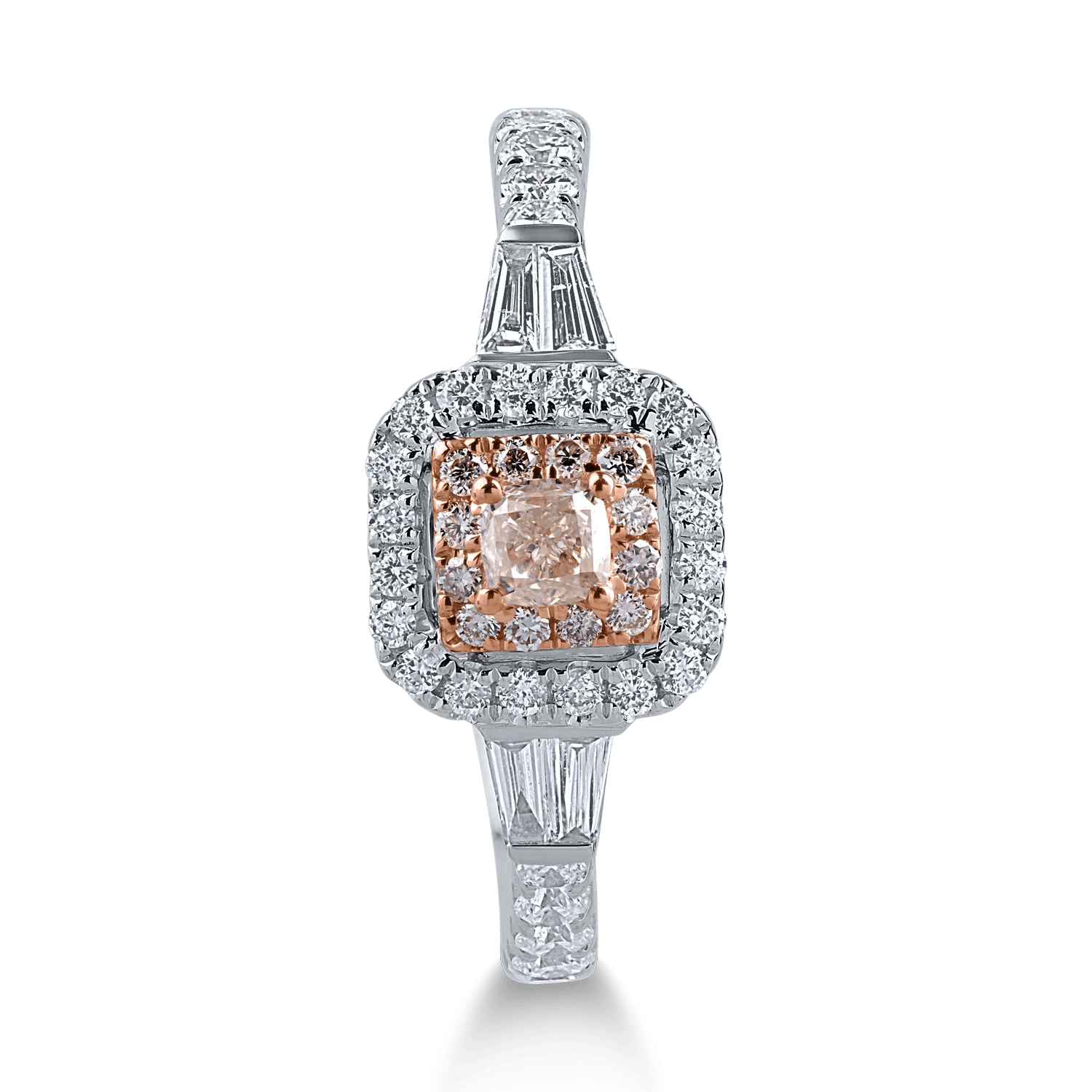 Acest inel din aur alb-roz îmbină modernitatea cu rafinamentul prin diamantele baguette și rotunde transparente de 0.62ct alături de diamantele roz cushion și rotunde de 0.29ct. Detaliile de tăietură oferă un echilibru delicat între eleganță și căldură.