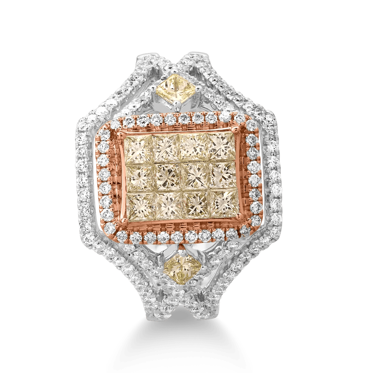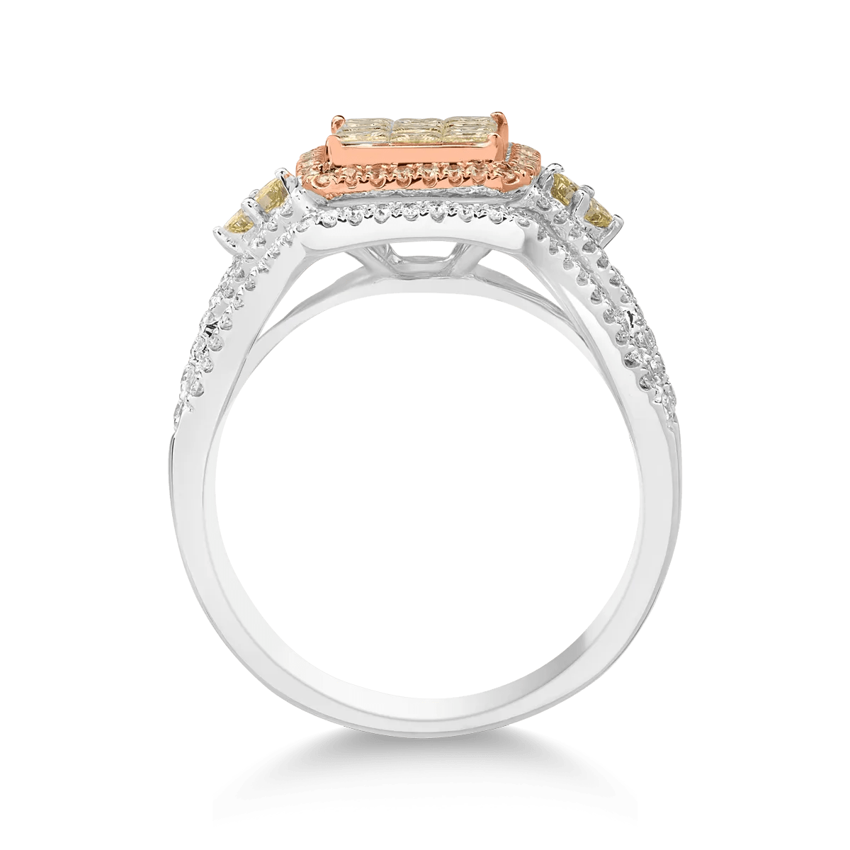 Descoperă rafinamentul acestui inel din aur alb-roz, înfrumusețat cu diamante galbene princess de 0.8ct și diamante transparente de 0.6ct.