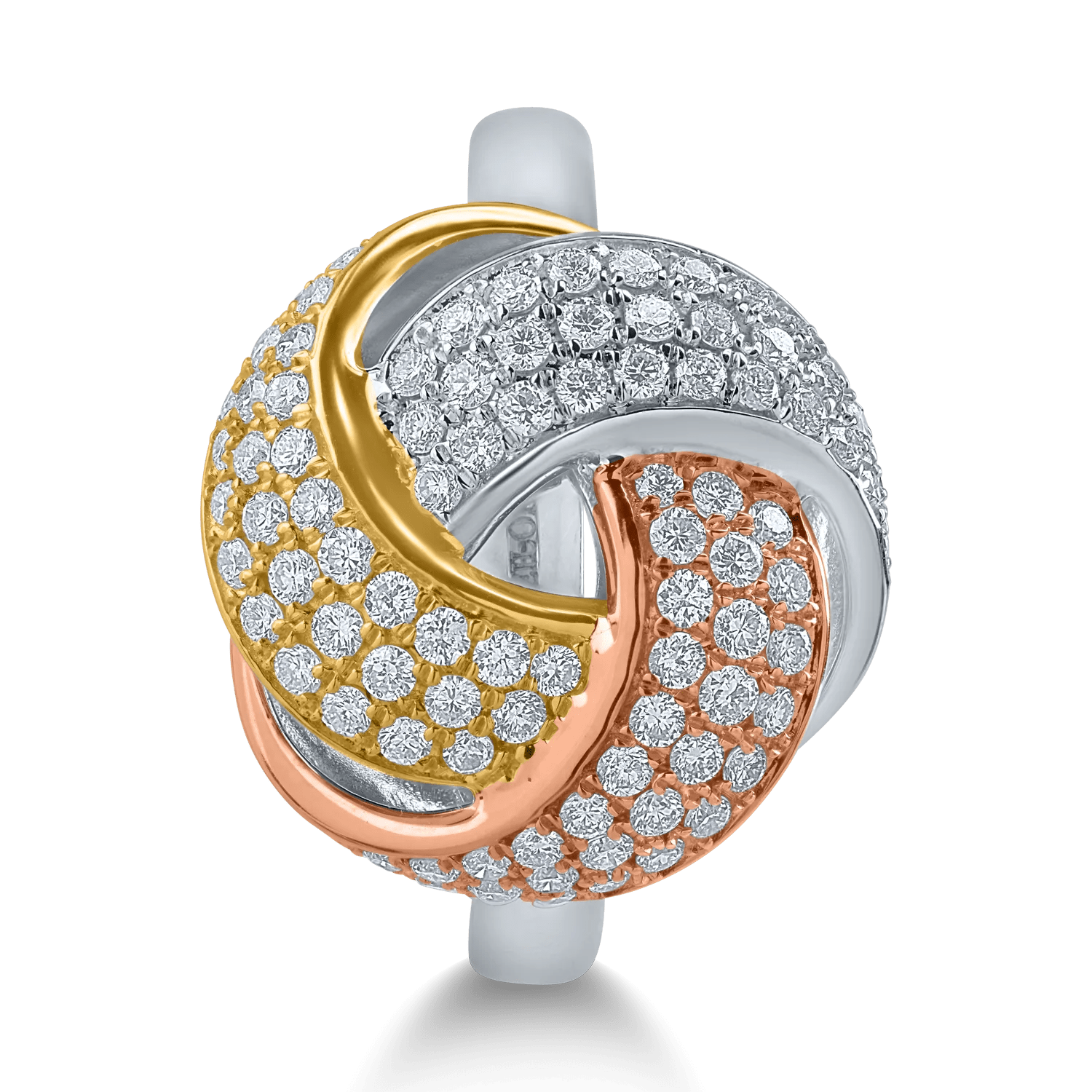 Strălucește cu un inel din aur alb, roz și galben, decorat cu diamante de 0.78ct. Alege această bijuterie cu un design misterios și elegant, perfectă pentru a-ți completa stilul.