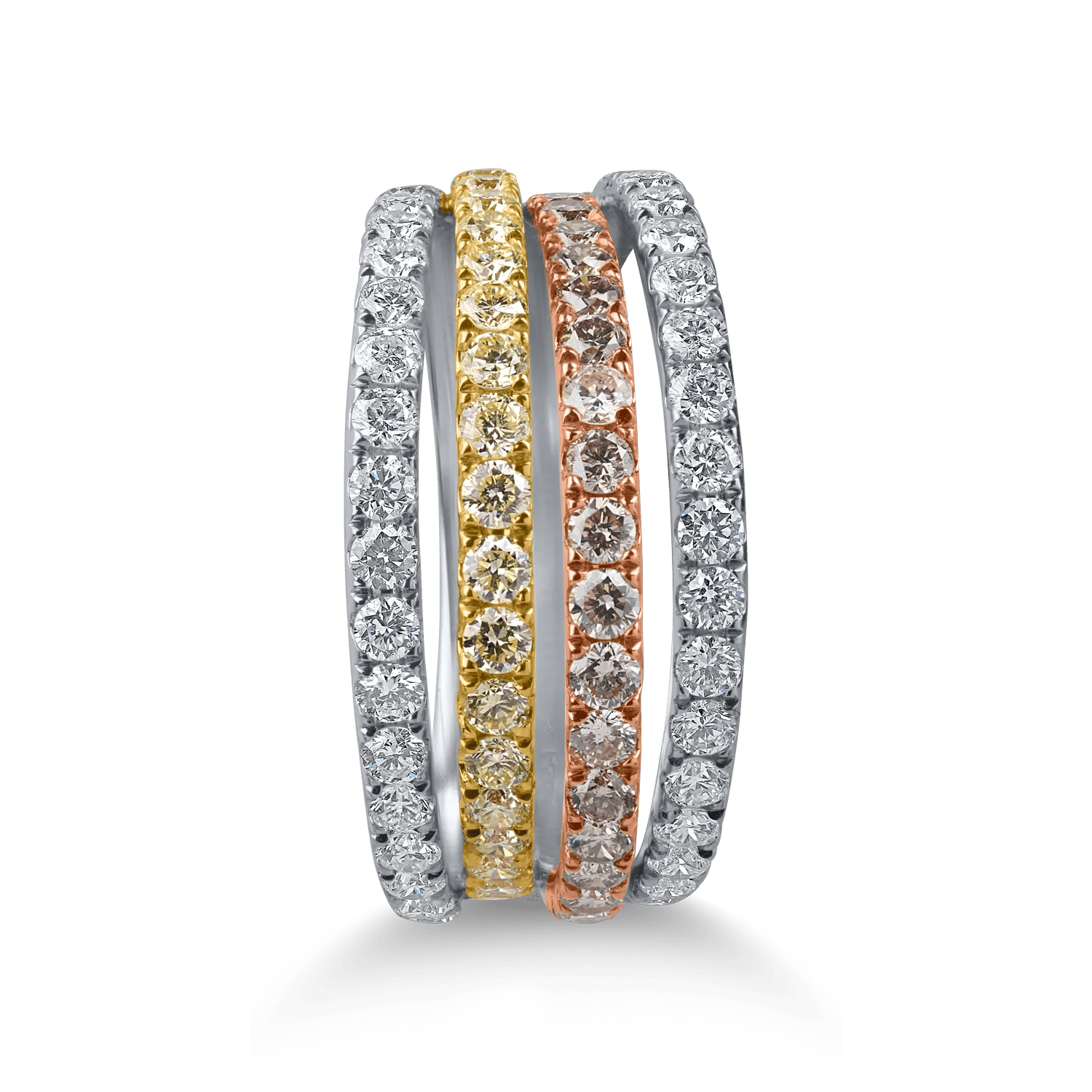 Acest inel îmbină modernitatea și stilul, fiind confecționat din aur alb, roz și galben și decorat cu diamante de 1.7ct în setare micro. Detaliile fine și liniile elegante adaugă o notă de originalitate oricărei ținute.