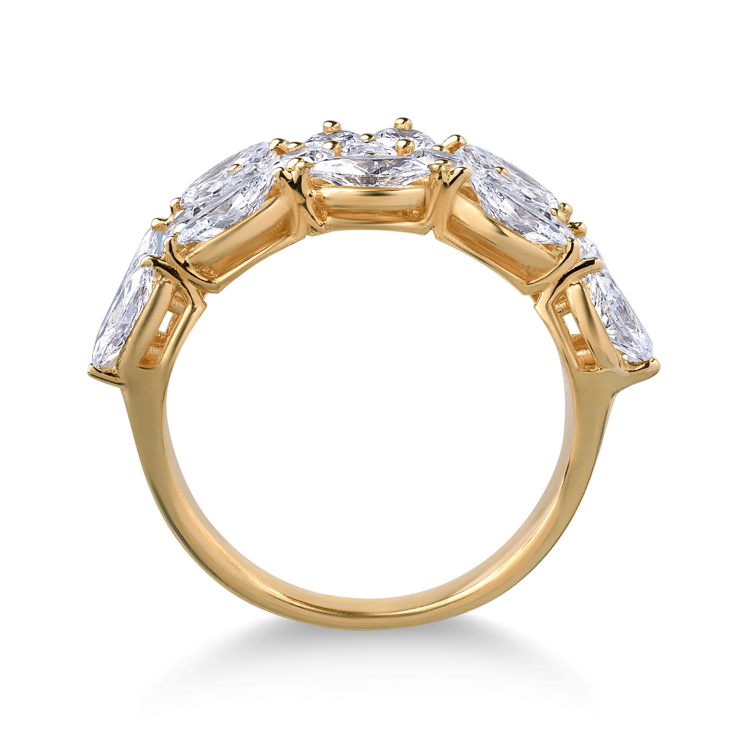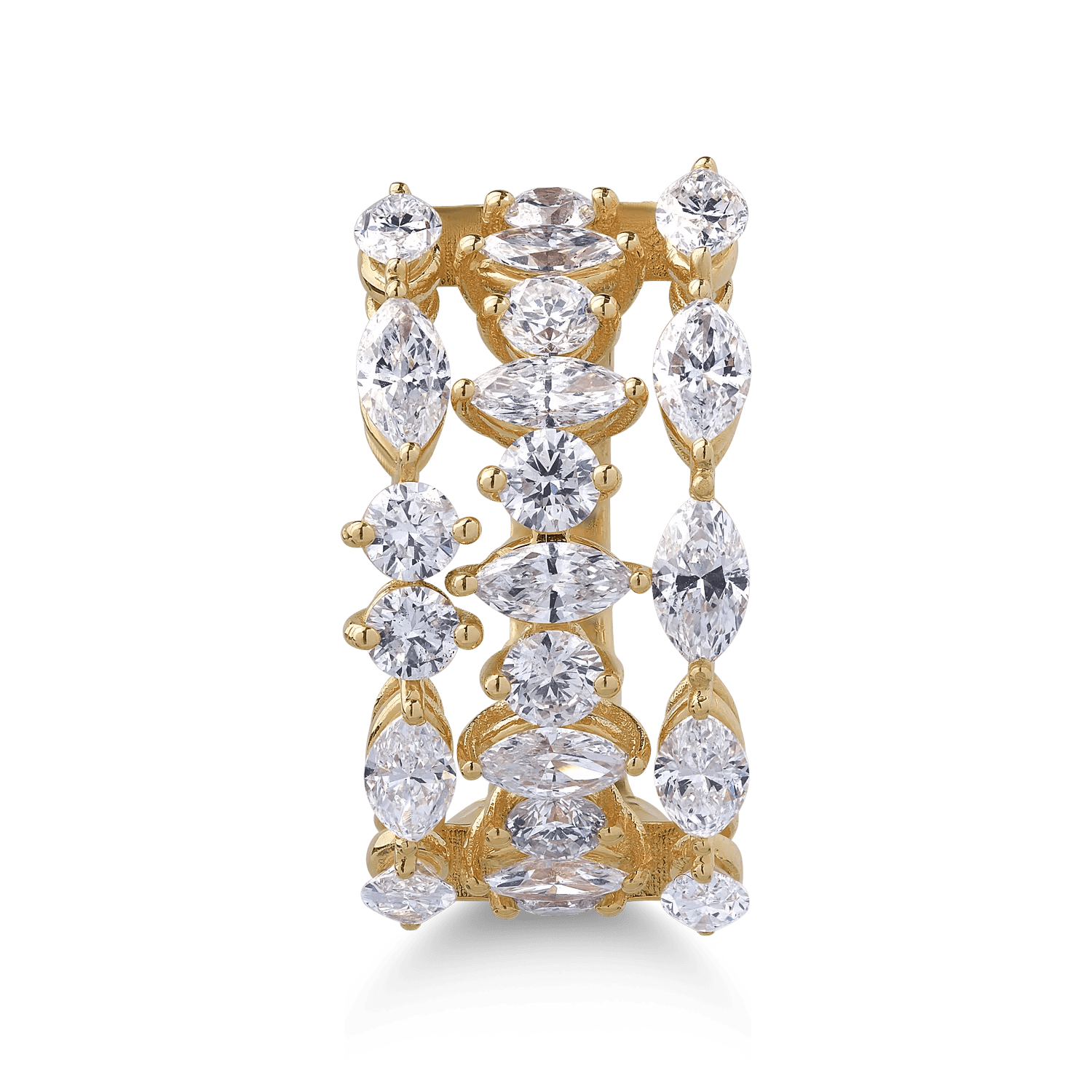Un inel rafinat din aur galben, înfrumusețat cu diamante marquise și rotunde de 2.8ct. Designul său îmbină armonios strălucirea diafană și eleganța caldă, făcându-l accesoriul perfect pentru orice ocazie. Taieturile marquise adaugă un efect alungit, iar diamantele rotunde oferă un plus de strălucire.