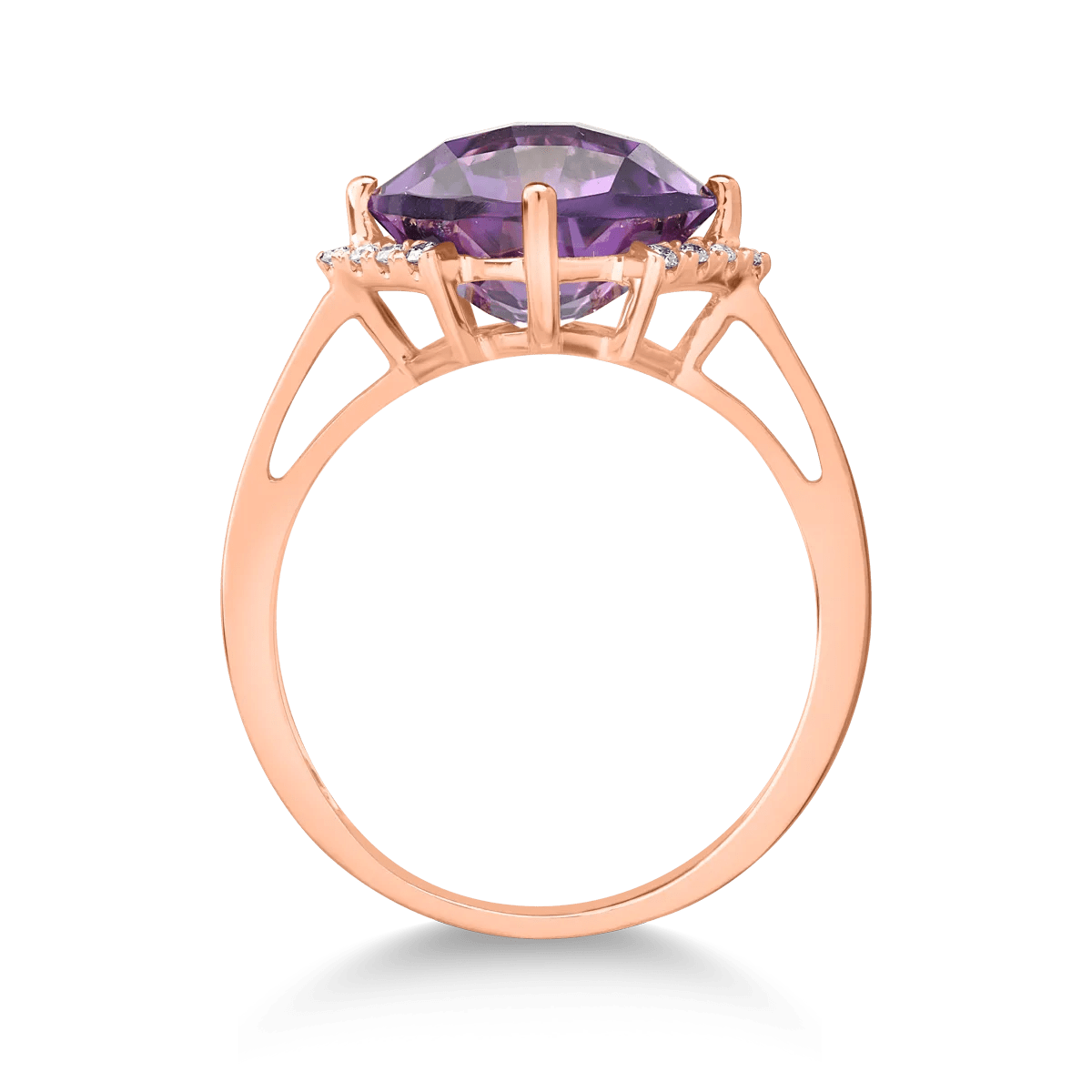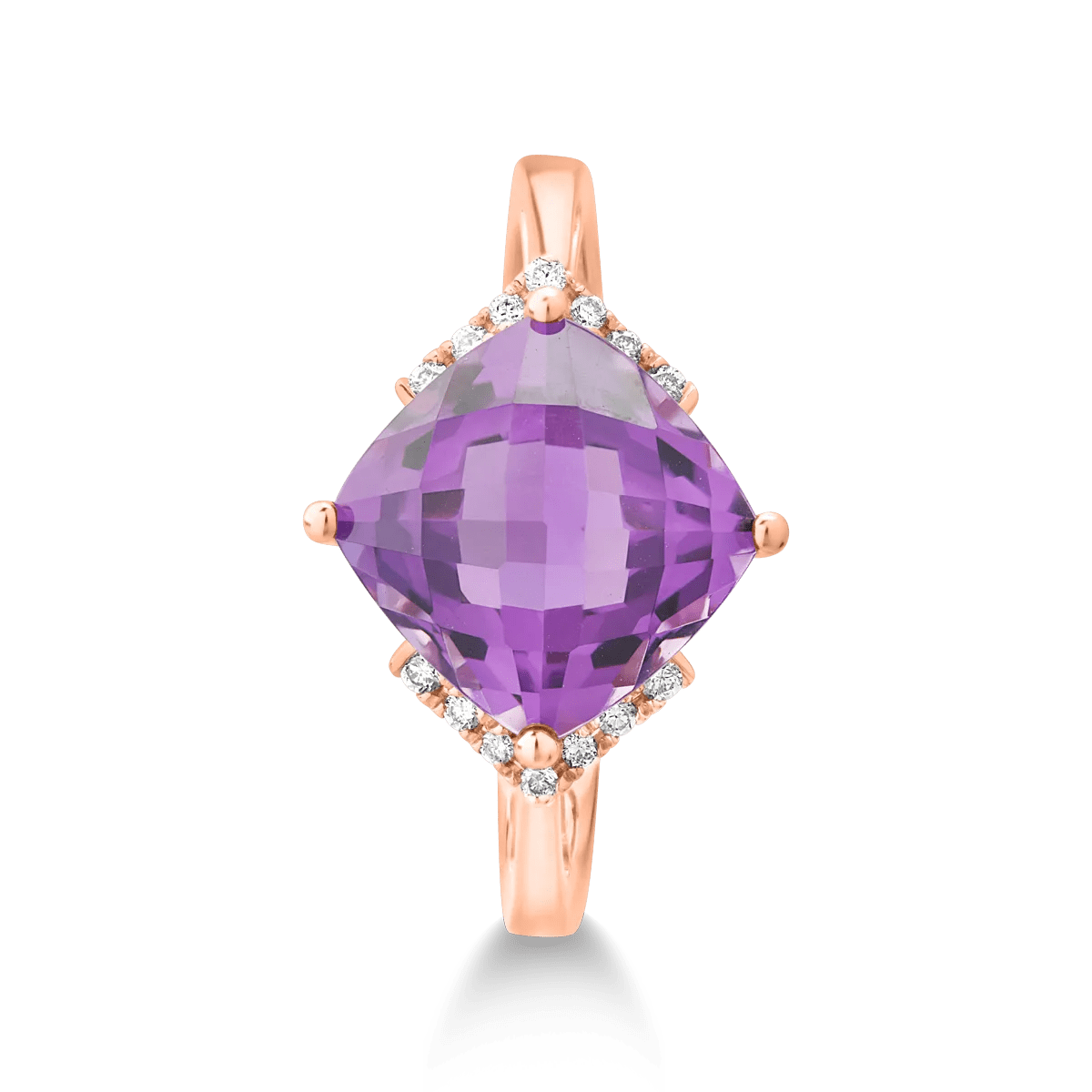 Descoperă un inel sofisticat din aur roz, accentuat de un ametist cu tăietura cushion de 3.3ct și diamante de 0.08ct. Ametistul, cu reflecțiile sale violet-aurii, combină modernitatea cu delicatețea, oferind un design atemporal și rafinat.