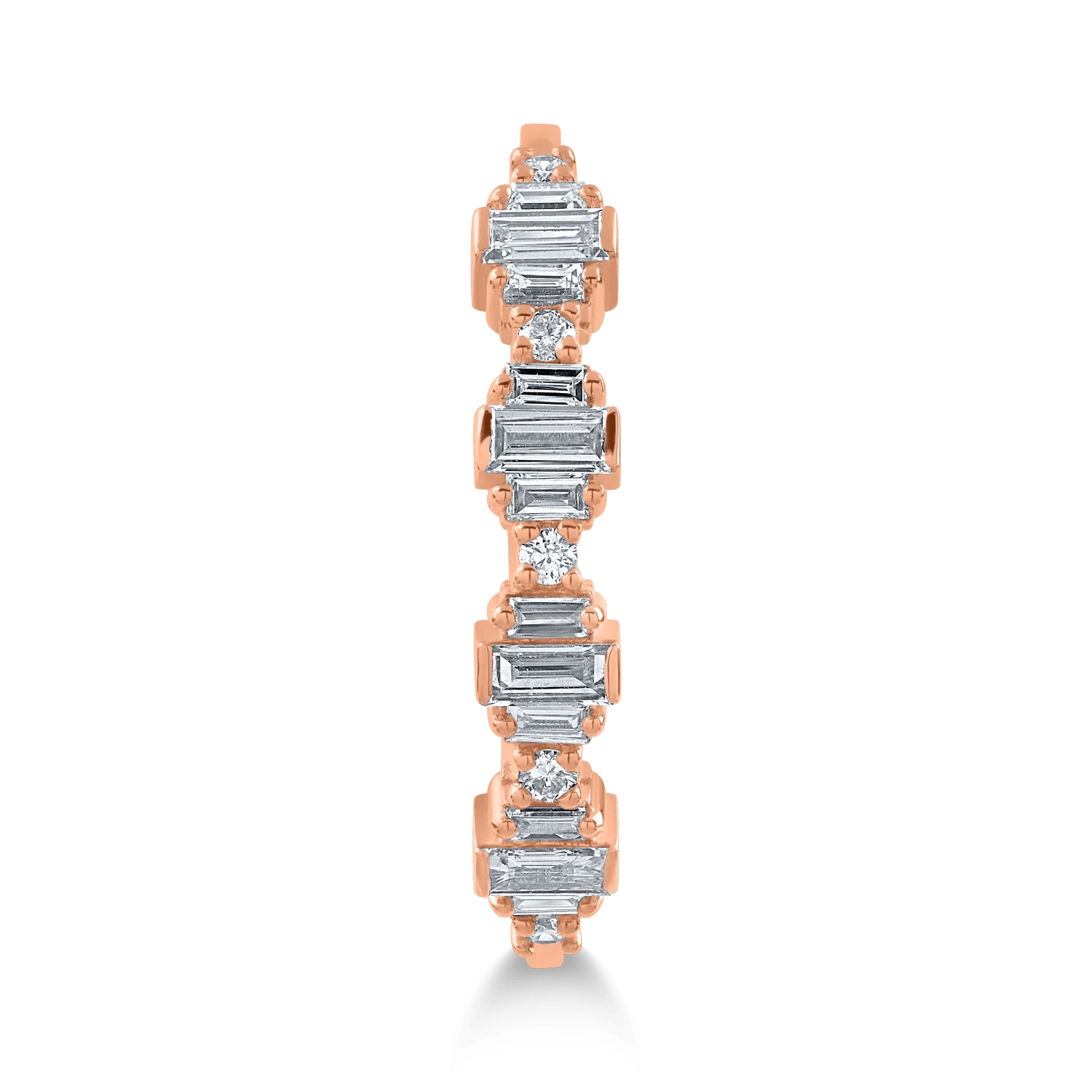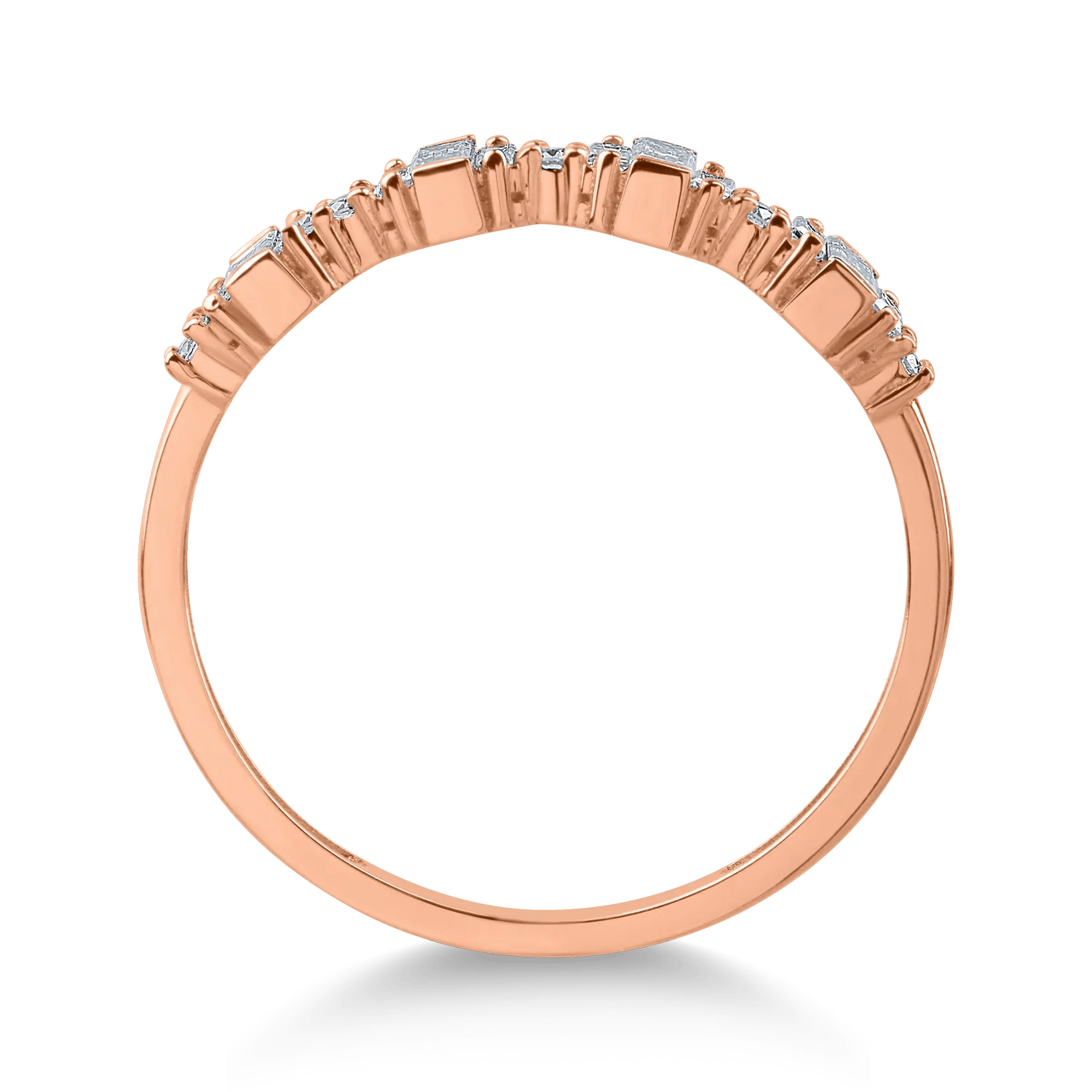 Acest inel din aur roz, însoțit de diamante cu tăietură baguette de 0.2ct, se remarcă printr-un design original și elegant. Geometria tăieturii baguette reflectă lumina într-un mod sofisticat, adăugând o notă modernă și rafinată oricărei ținute.