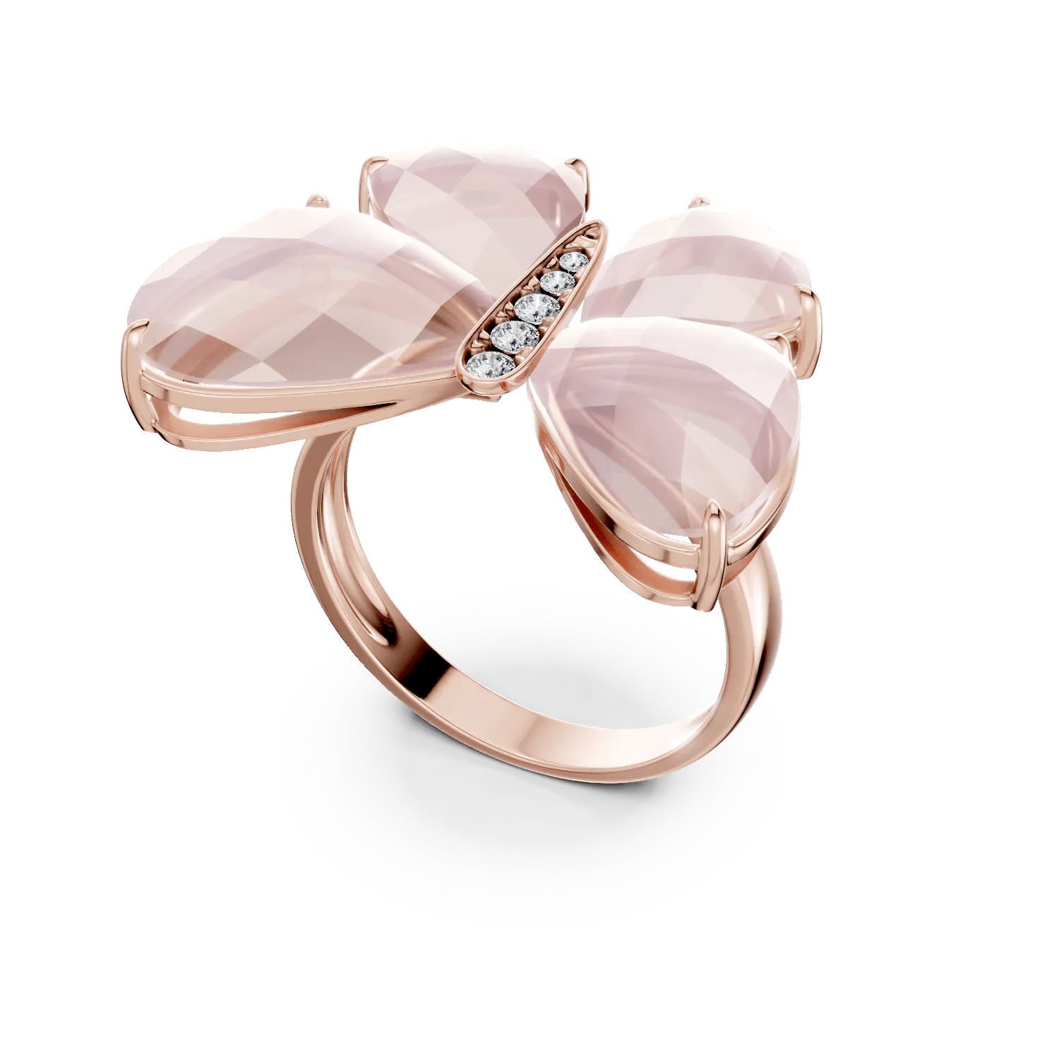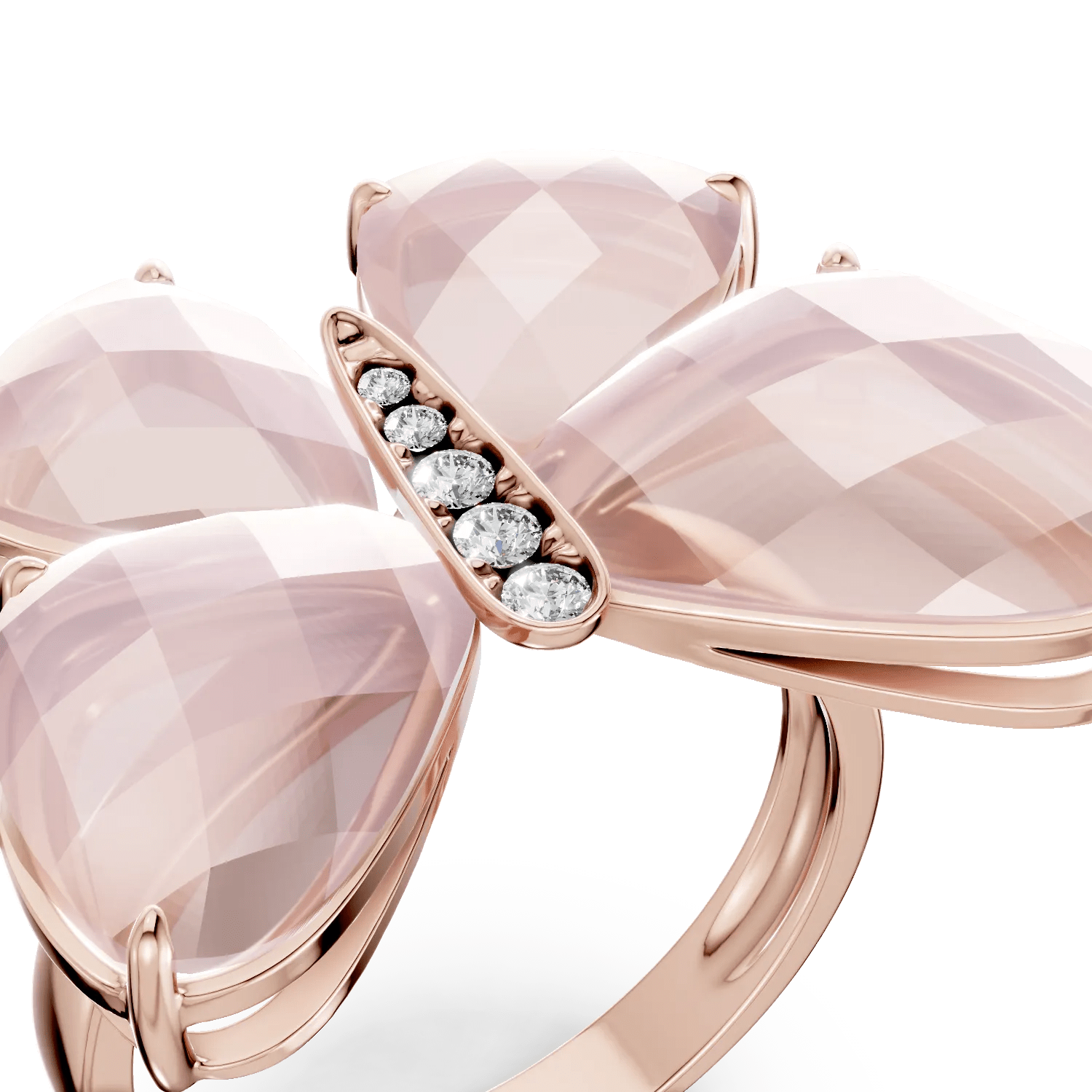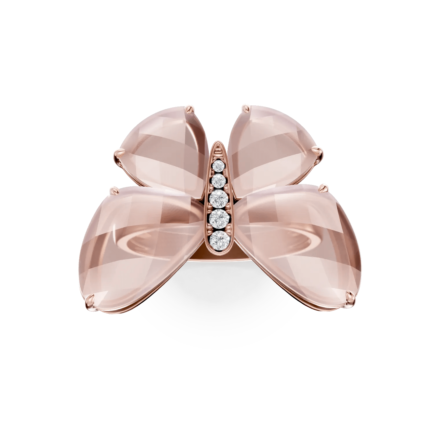 Îmbogățește-ți stilul cu acest inel delicat, realizat din aur roz, decorat cu un fluture. Piesa aduce în prim-plan un quartz trandafiriu de 13.4ct și diamante de 0.07ct, îmbinând nuanțe vibrante ce radiază eleganță.