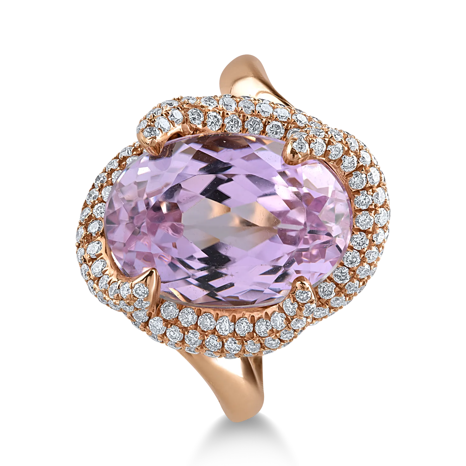 Descoperă un inel din aur roz, înzestrat cu un kunzit de 8.8ct, tăiat oval, și diamante de 1.07ct. Această bijuterie reprezintă eleganța desăvârșită și este creată pentru a-ți evidenția stilul unic.