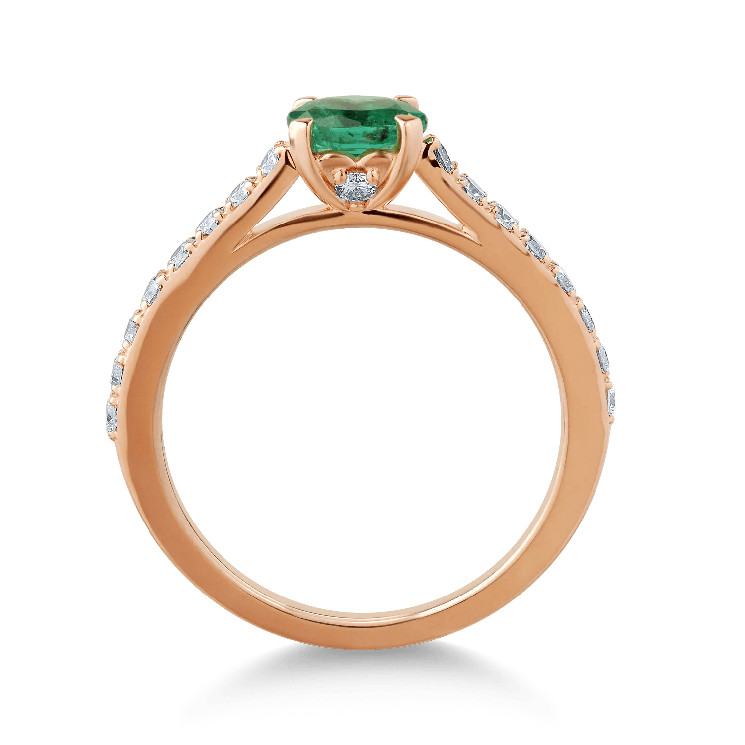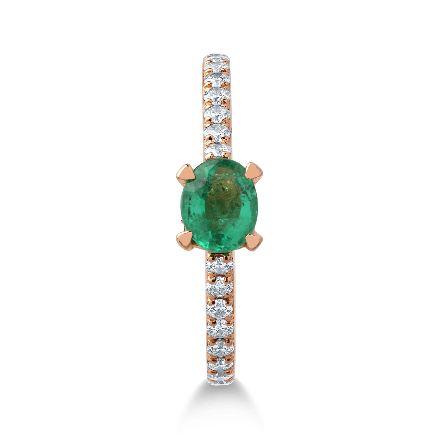 Bijuteria perfectă pentru a sublinia misterul și eleganța. Acest inel din aur roz combină un smarald oval de 0.5ct cu diamante strălucitoare de 0.3ct. Designul rafinat accentuează frumusețea naturală a pietrelor, oferind o strălucire deosebită. O alegere ideală pentru femeile care îmbină feminitatea cu forța interioară.