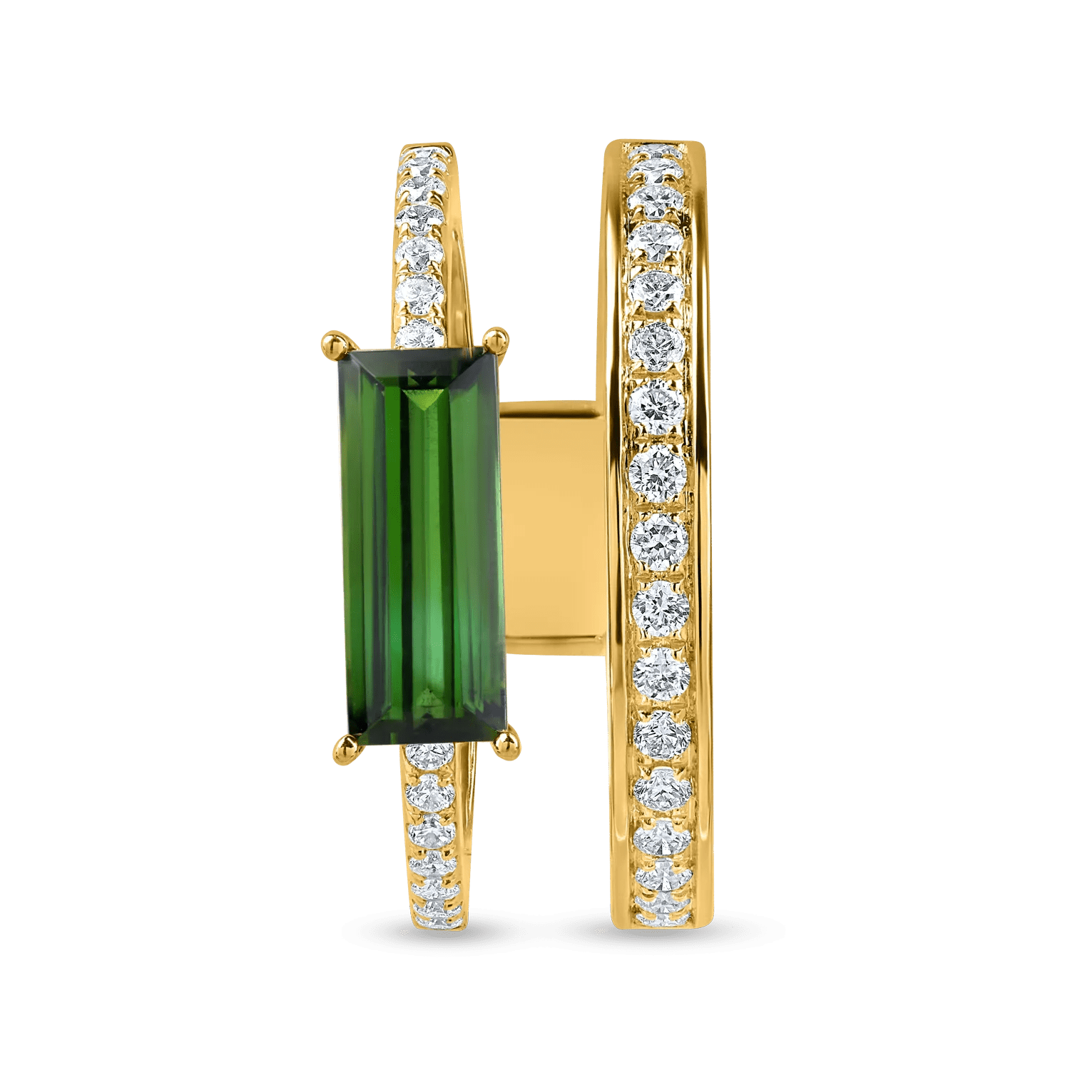 Acest inel dublu, realizat din aur galben, îmbină eleganța turmalinei verzi de 1.3ct cu strălucirea diamantelor de 0.3ct. Designul său modern evidențiază frumusețea pietrelor prin tăietura rectangulară a turmalinei, oferindu-i un aer sofisticat și dinamic. Bijuteria reflectă un echilibru între forță și rafinament.