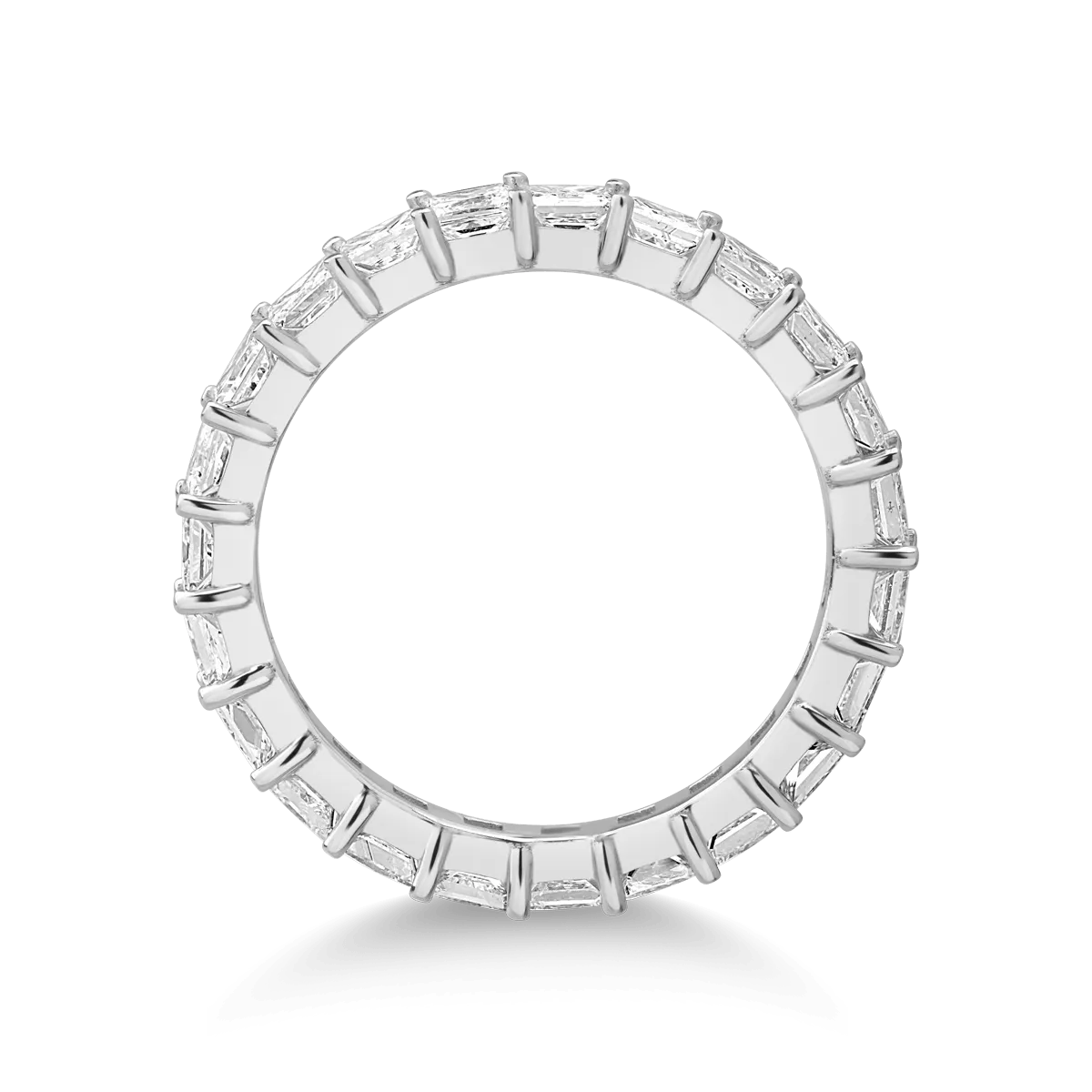 Acest inel eternity din aur alb cu diamante de 2.5 carate, tăietură princess, emană eleganță atemporală. Pietrele sunt îmbinate într-un șir continuu de strălucire, simbolizând iubirea eternă. Tăietura princess, cu fatete precise, subliniază rafinamentul diamantelor, transformând inelul într-o piesă iconică pentru femeile care apreciază luxul.