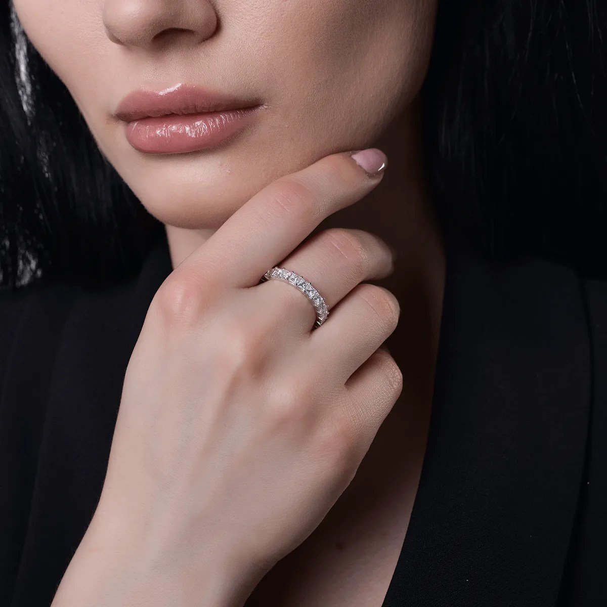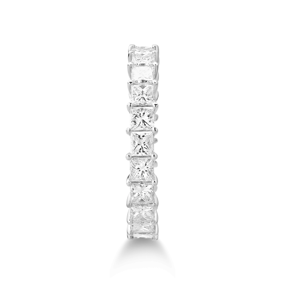 Acest inel eternity din aur alb cu diamante tăiate princess de 2.4ct redefinește eleganța atemporală. Pietrele sunt armonios aliniate, simbolizând iubirea nesfârșită și evidențiind puritatea. Designul continuu și taietura princess aduc o notă de lux feminin desăvârșit.