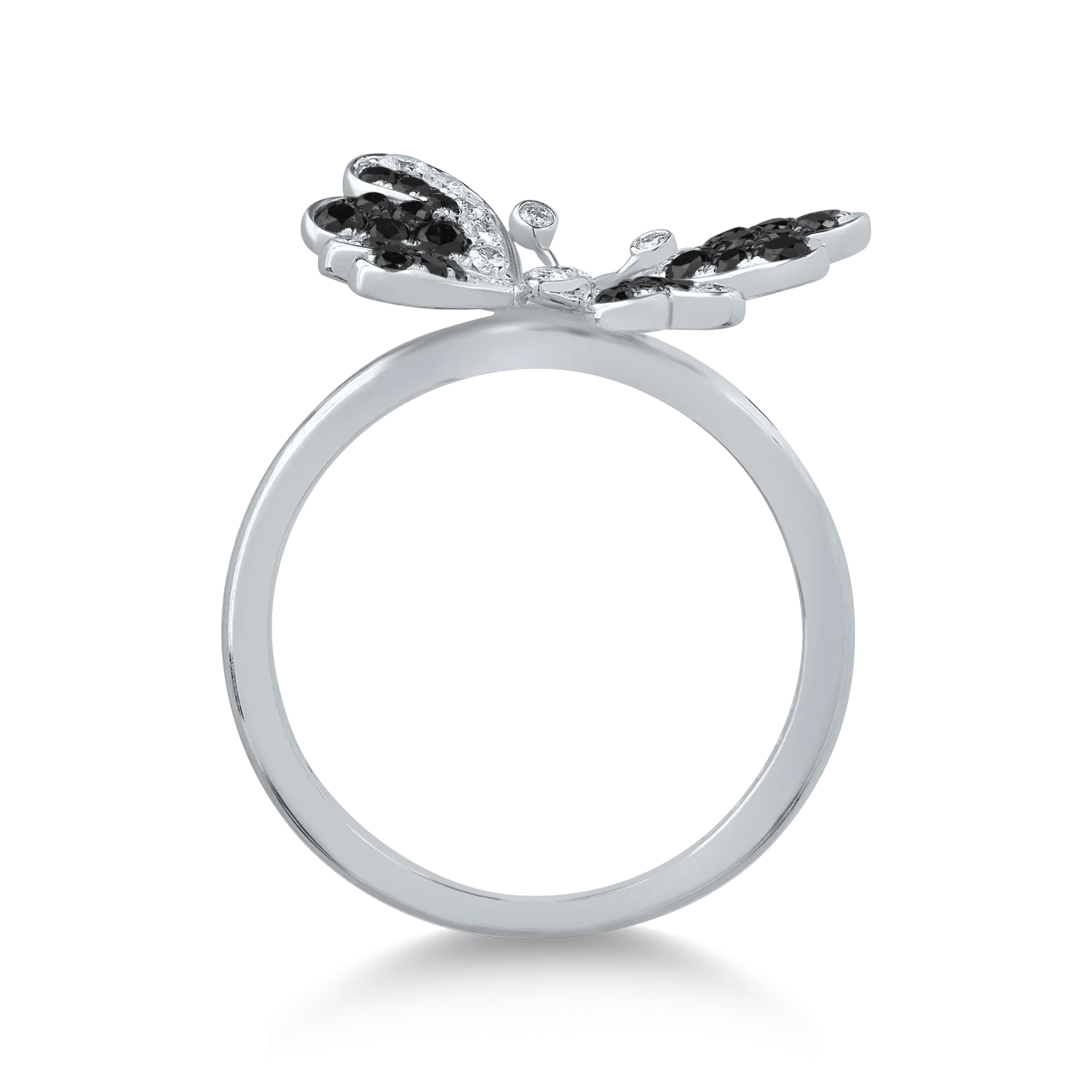 Inelul Fluture din aur alb este decorat cu diamante negre de 0.33ct și diamante transparente de 0.25ct, simbolizând eleganța și rafinamentul. Această bijuterie este creată pentru a evidenția feminitatea și stilul personal.