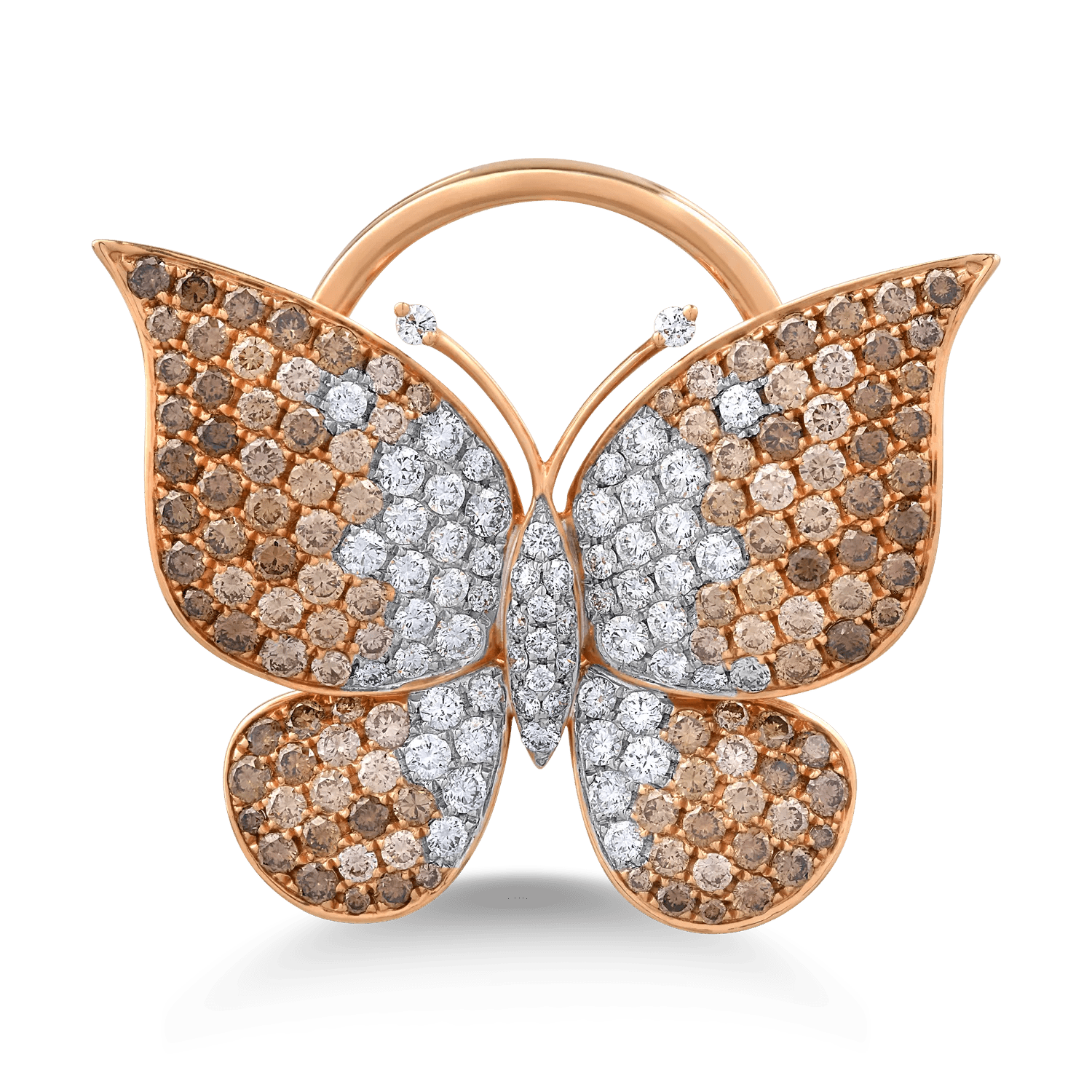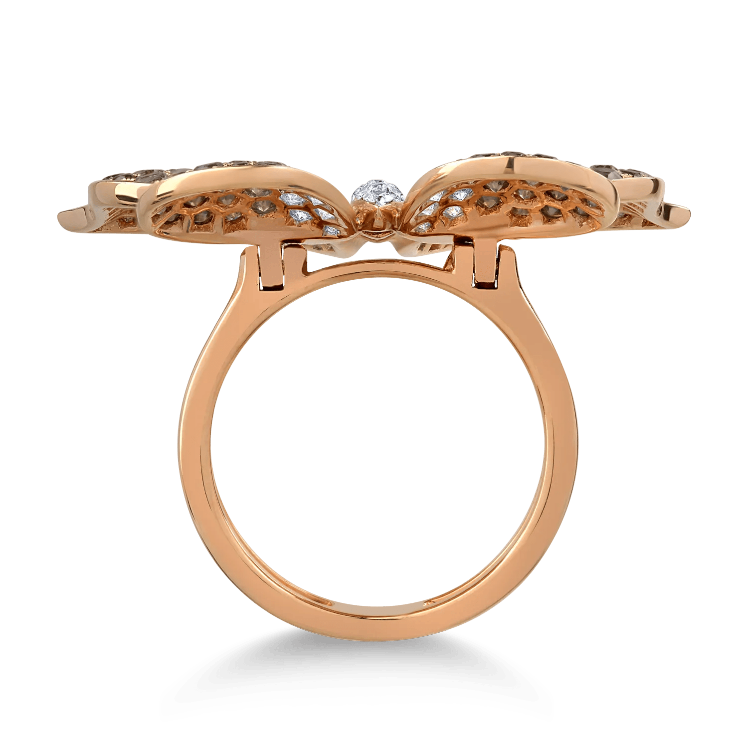 Acest inel fluture din aur roz cu diamante maro de 2.3ct și diamante transparente de 0.98ct adaugă o notă de feminitate și atitudine. Creat din pasiune pentru accesorii distinctive, este o invitație la a explora frumusețea și a-ți spune povestea. TEILOR îți oferă ocazia să creezi povești unice.