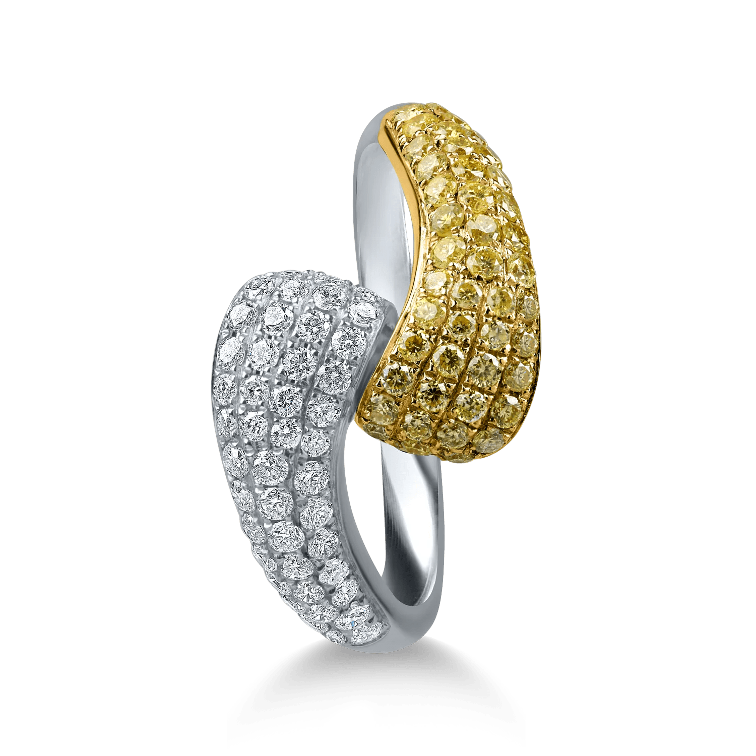 Acest inel este realizat din aur alb-galben, featuring diamante galbene și incolore de 0.86ct, îmbinând forme clasice cu un stil modern. O piesă îndrăzneață, dar ușor de purtat, ce reflectă personalitatea ta la TEILOR.