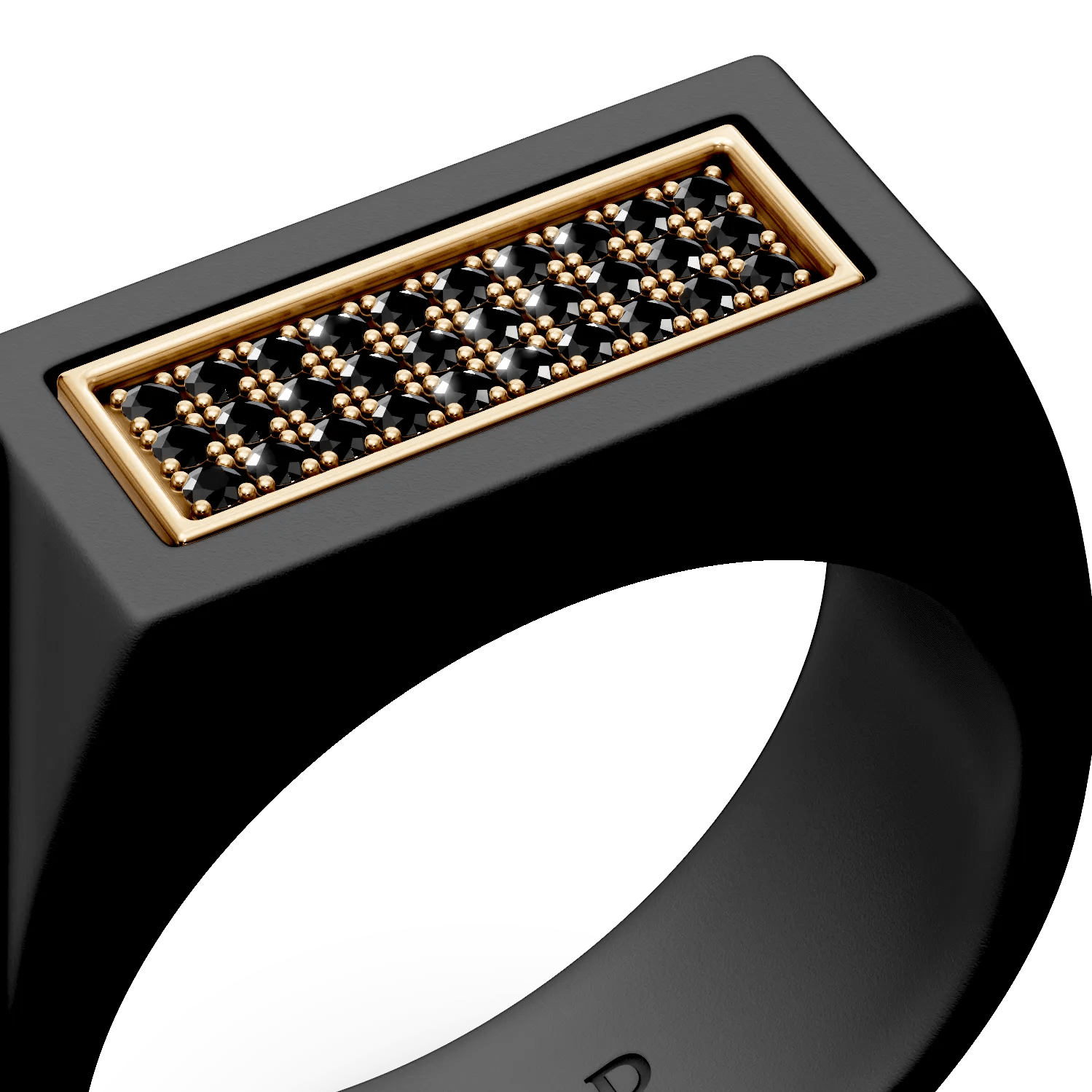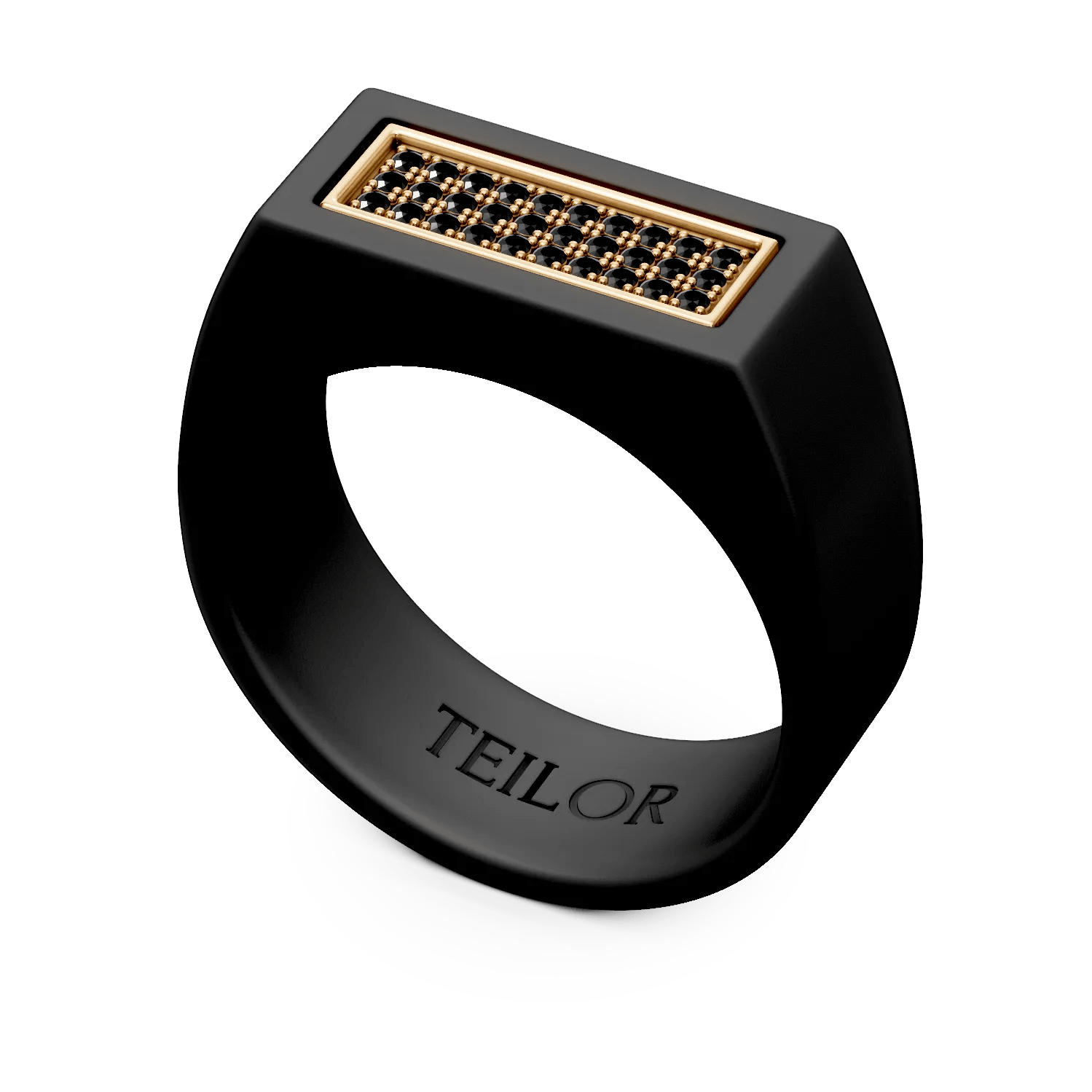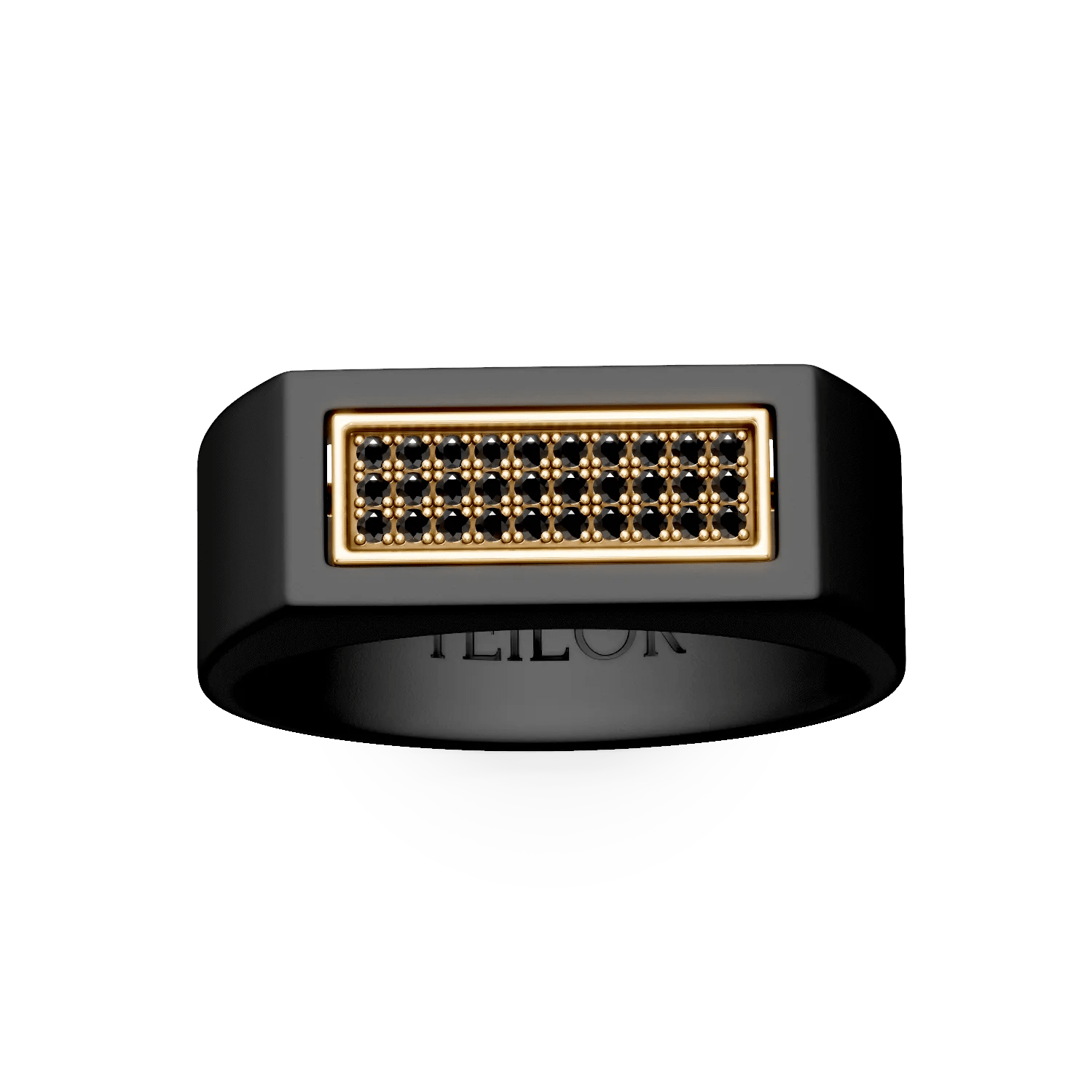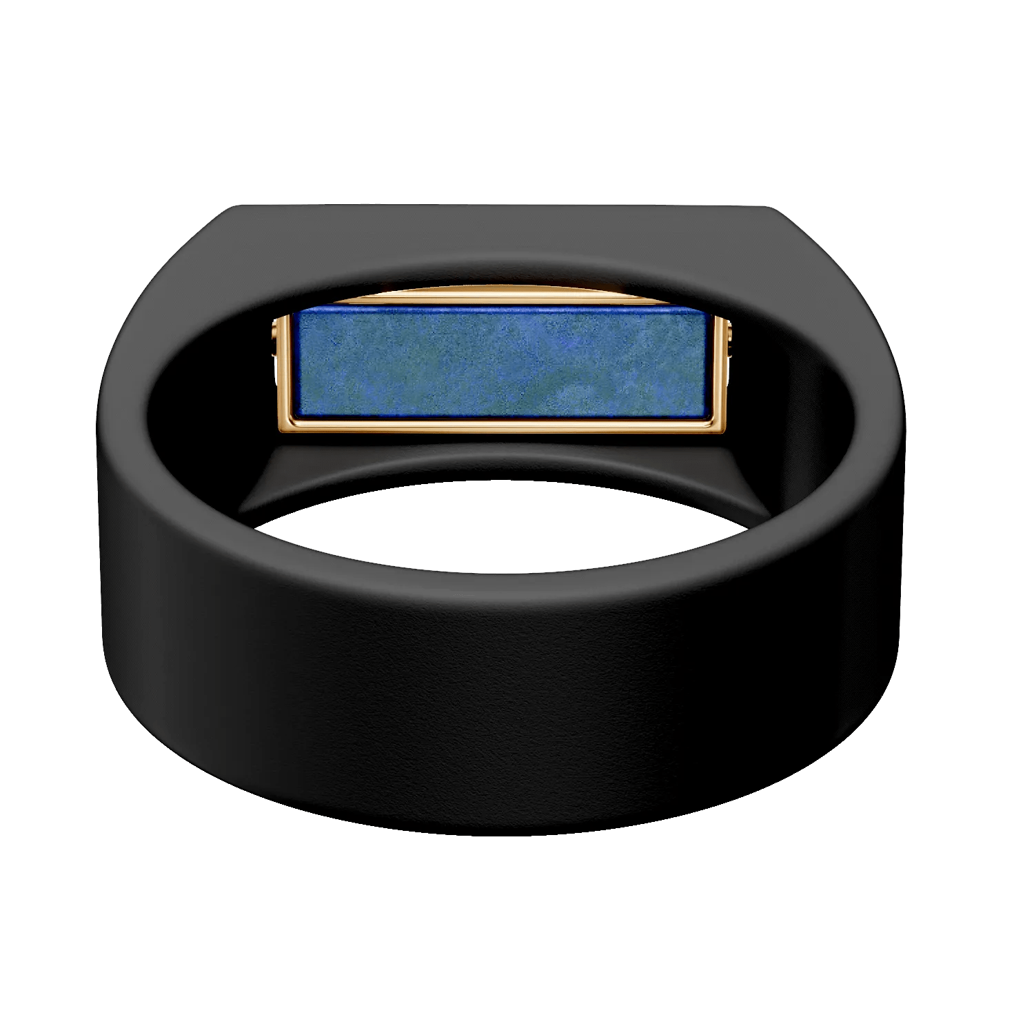 Inelul Gravity combină designul arhitectural de precizie cu eleganța contrastelor. Fabricat din titan și aur galben, include un element rotativ ce dezvăluie două fațete distincte: diamante negre de 0.1ct și lapis lazuli de 0.8ct, într-o formă pură și masculină.