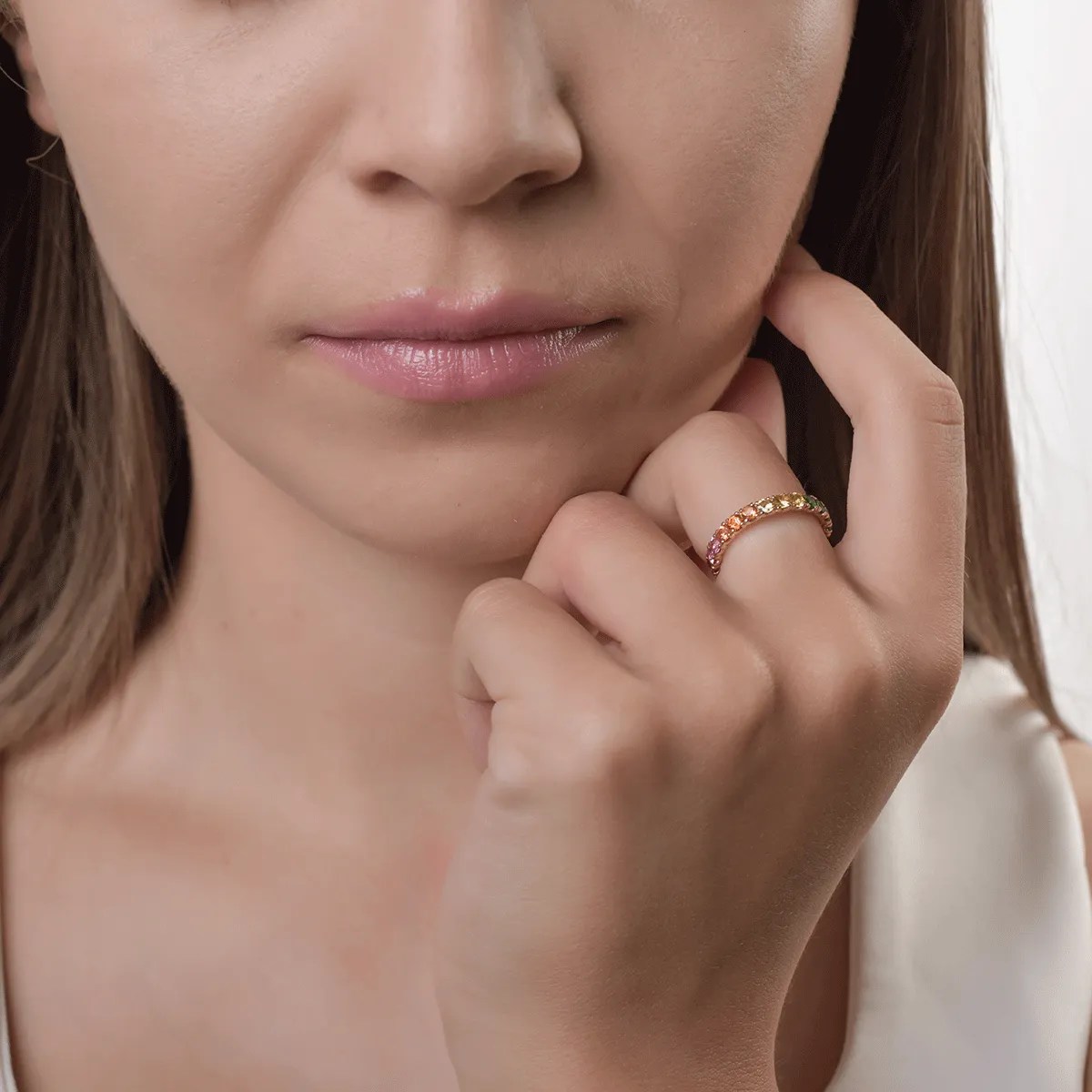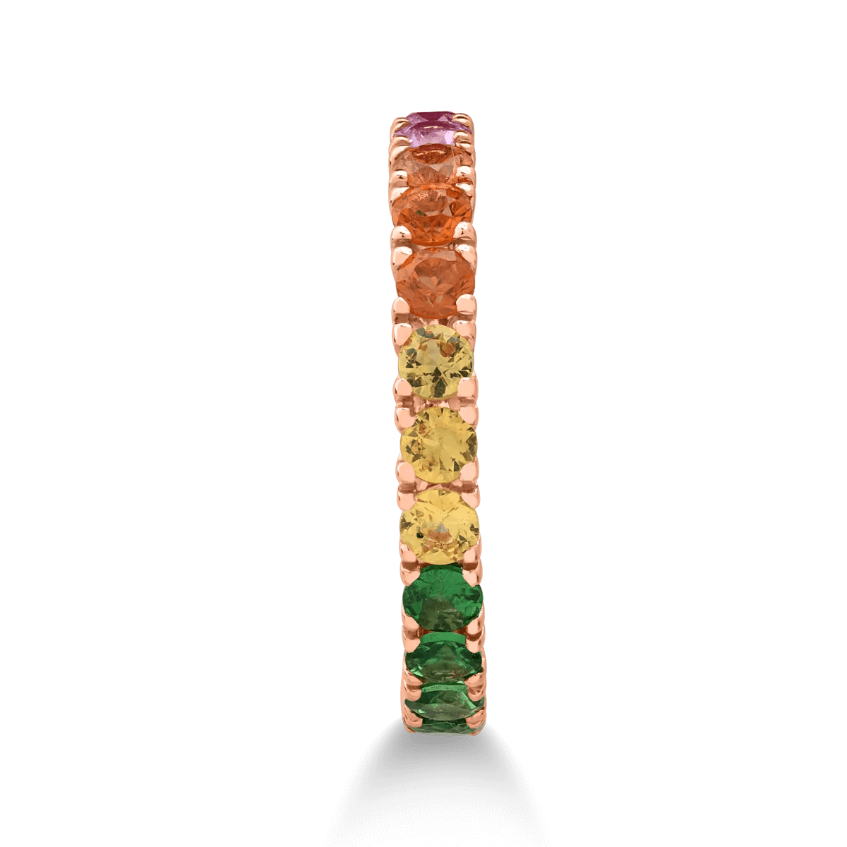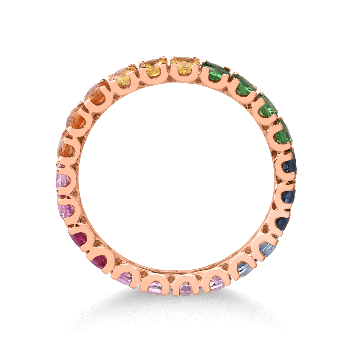Acest inel Infinity din aur roz este împodobit cu safire multicolore de 1.75ct, adăugând un plus de stil oricărei ținute. Alege-l pentru a-ți evidenția personalitatea cu eleganță.