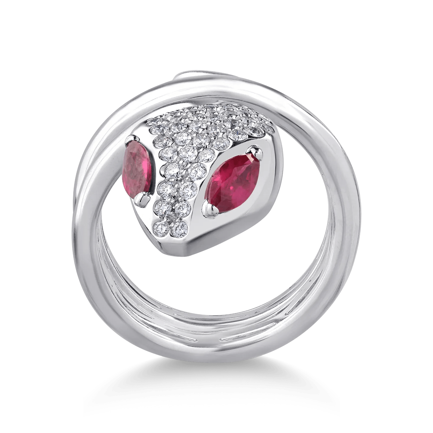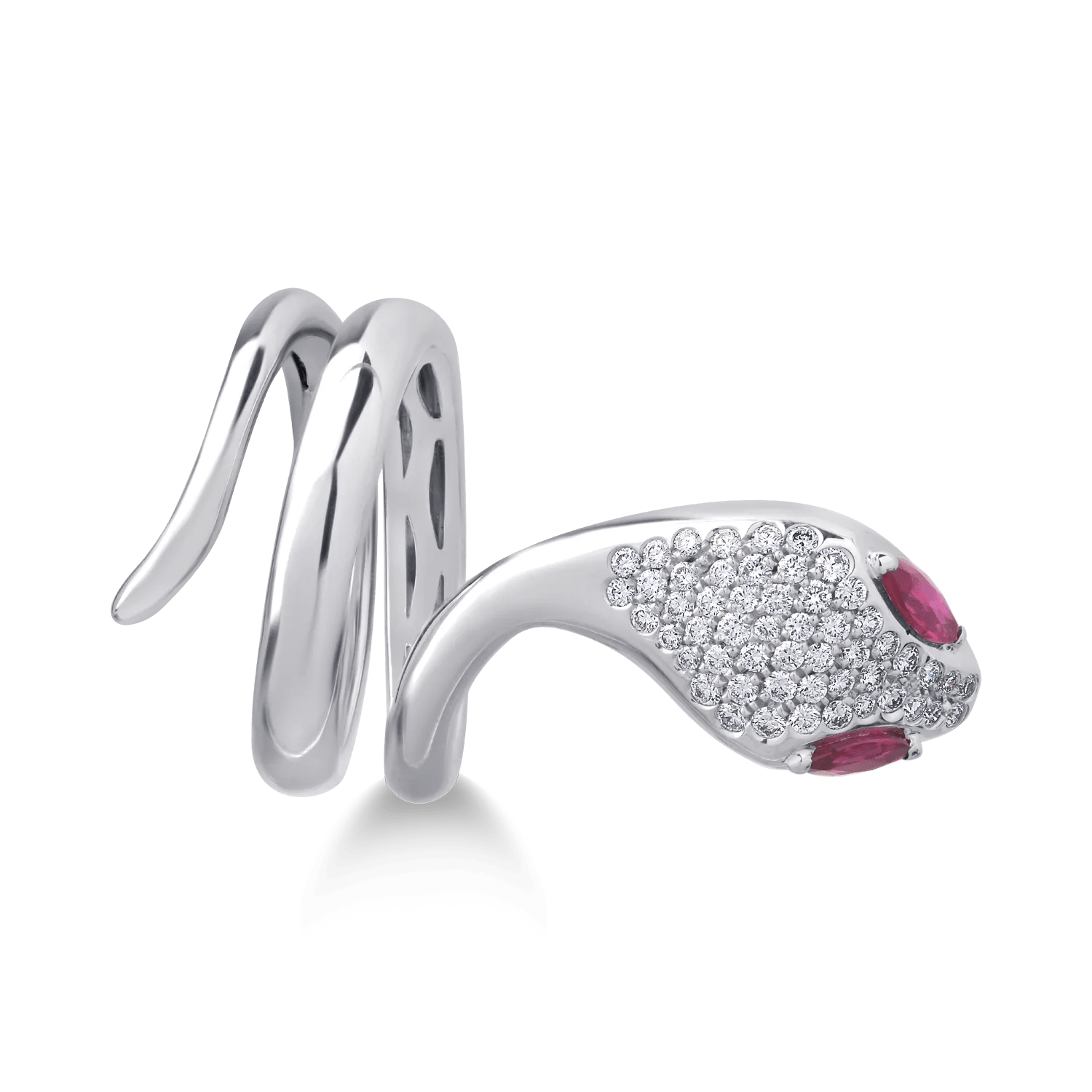Bijuteria îmbină creativitatea cu expresivitatea pentru un look desăvârșit. Inelul șarpe din aur alb cu rubine marquise de 0.5ct și diamante de 0.5ct oferă un design fluid și detalii spectaculoase. Contrastul dintre rubinele roșii și strălucirea diamantelor creează o armonie perfectă, iar aurul alb conferă un finisaj sofisticat.