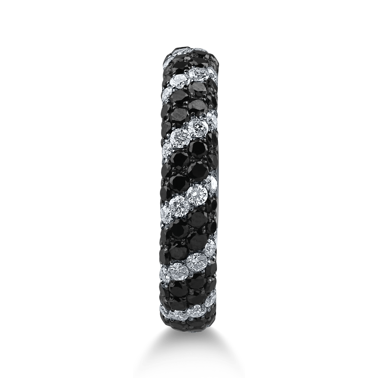 Experimentează un design modern și sofisticat cu acest inel semi eternity, realizat din aur alb. Bijuteria combină diamante negre de 1.18ct și diamante transparente de 0.52ct, oferindu-ți un aspect misterios și rafinat.