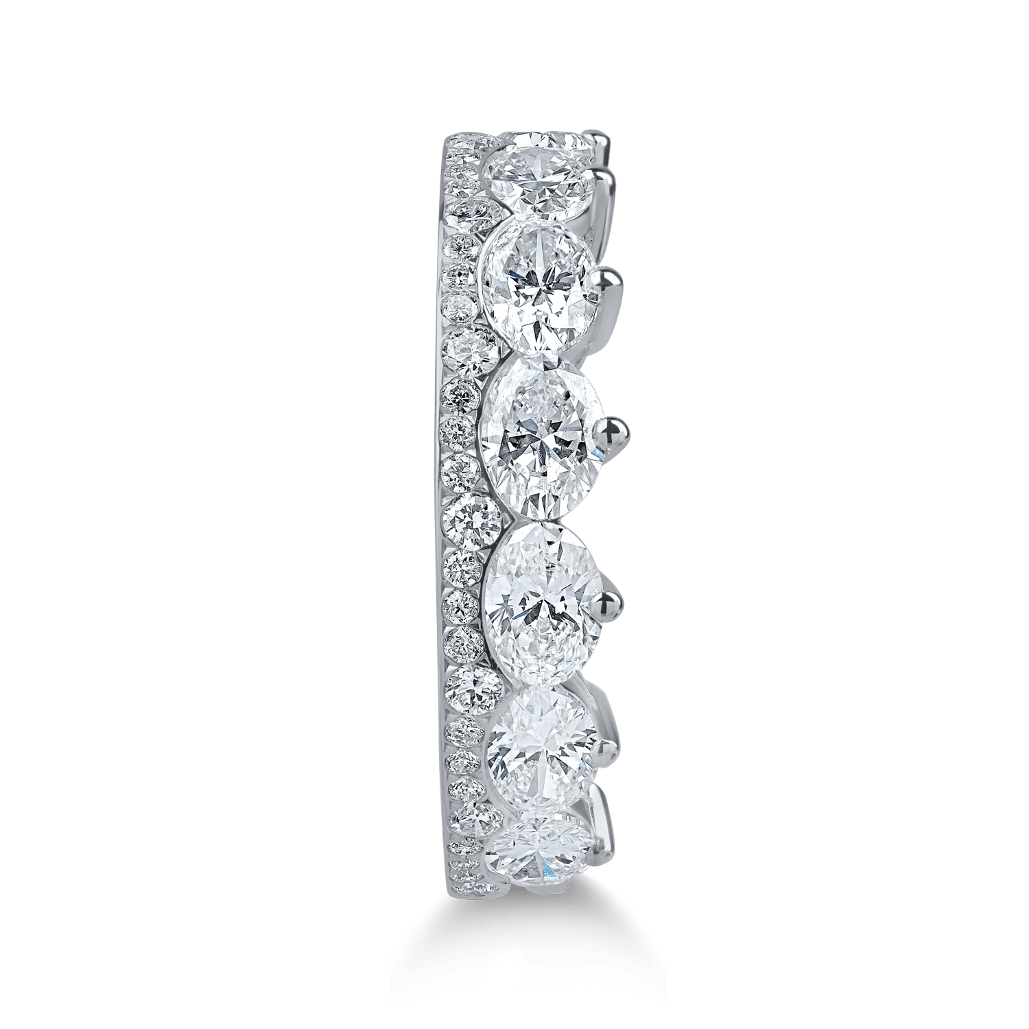 Acest inel semi eternity din aur alb, decorat cu diamante ovale și rotunde de 1.5ct, reflectă rafinament și modernitate. Designul său unic îmbină eleganța clasică cu strălucirea contemporană. Taieturile ovale conferă strălucire și fluiditate, în timp ce structura semi eternity simbolizează echilibrul perpetuu. Luciul pur și atemporal al aurului alb îl face potrivit pentru orice eveniment.