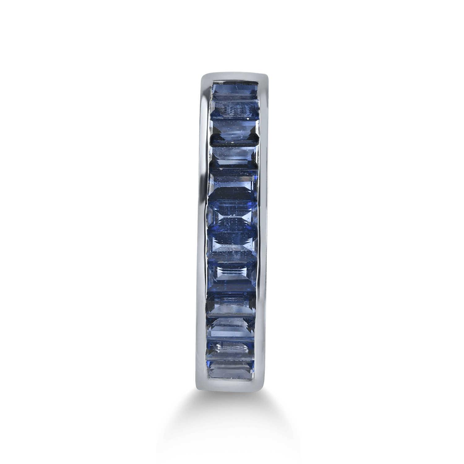 Descoperă frumusețea unui inel semi eternity din aur alb, ornamente cu safire tăiate baguette de 1.7ct. Designul său original evidențiază alinierea impecabilă a pietrelor și strălucirea lor subtilă. Tăietura baguette adaugă un stil modern și echilibrat, subliniind adâncimea culorii safirelor. Această bijuterie îmbină perfect eleganța clasică cu rafinamentul contemporan.