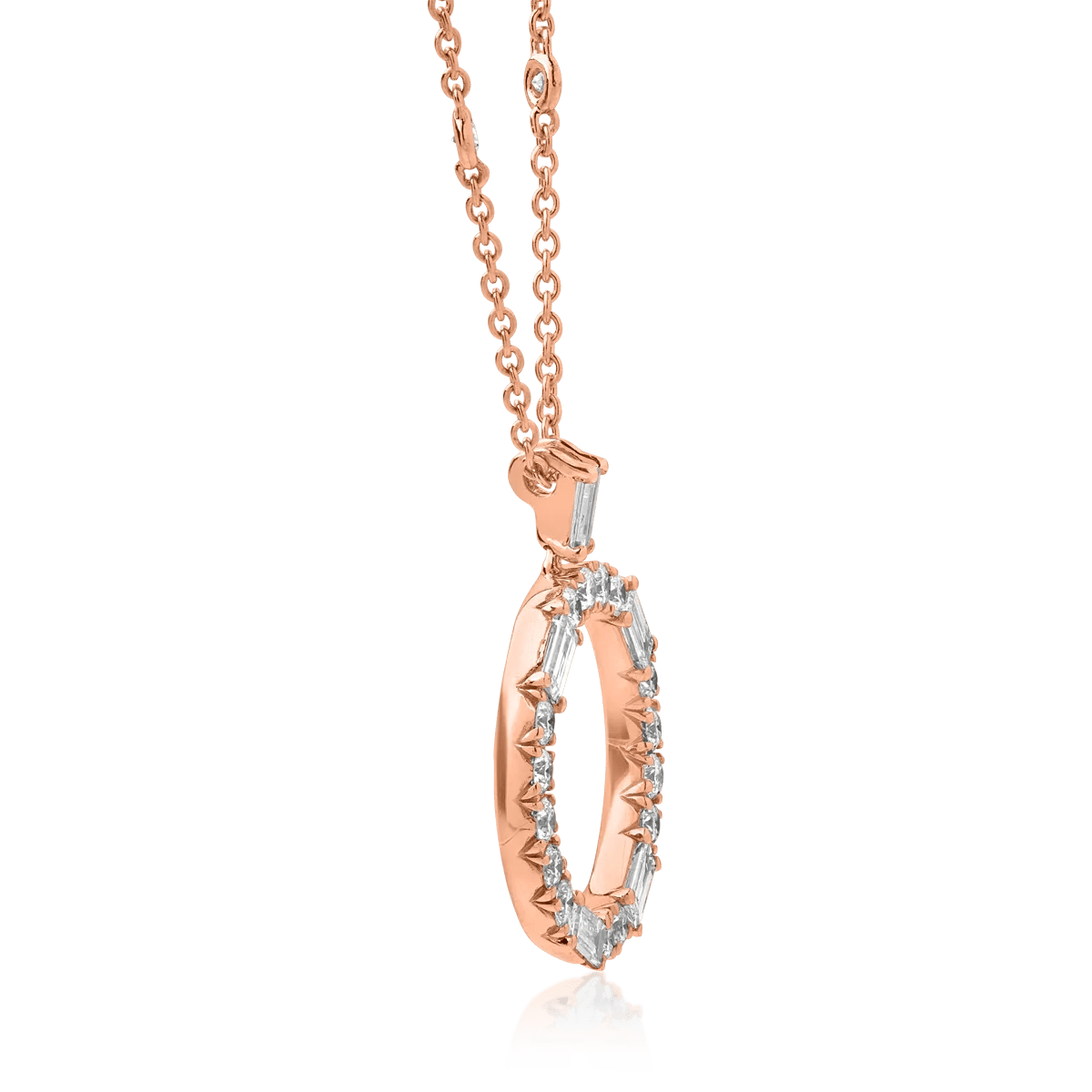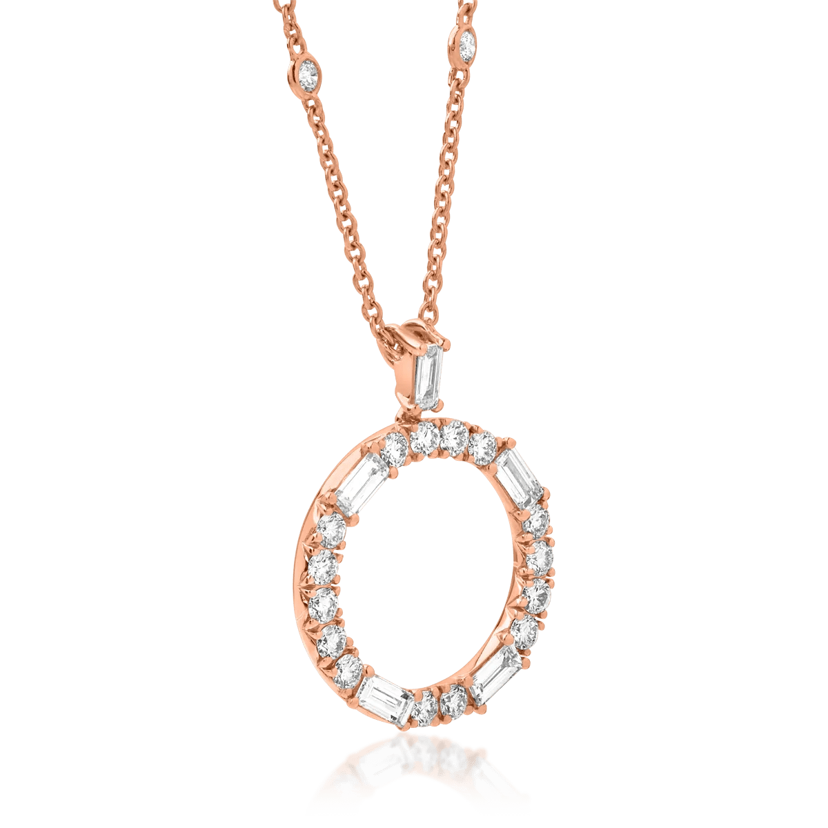 Acest lanț cu pandantiv cerc din aur roz este decorat cu diamante baguette și rotunde, totalizând 1.38ct. Designul său combină cu grație precizia geometrică a tăieturii baguette cu strălucirea dinamică a diamantelor rotunde, oferind astfel un simbol al delicateții și al puterii.