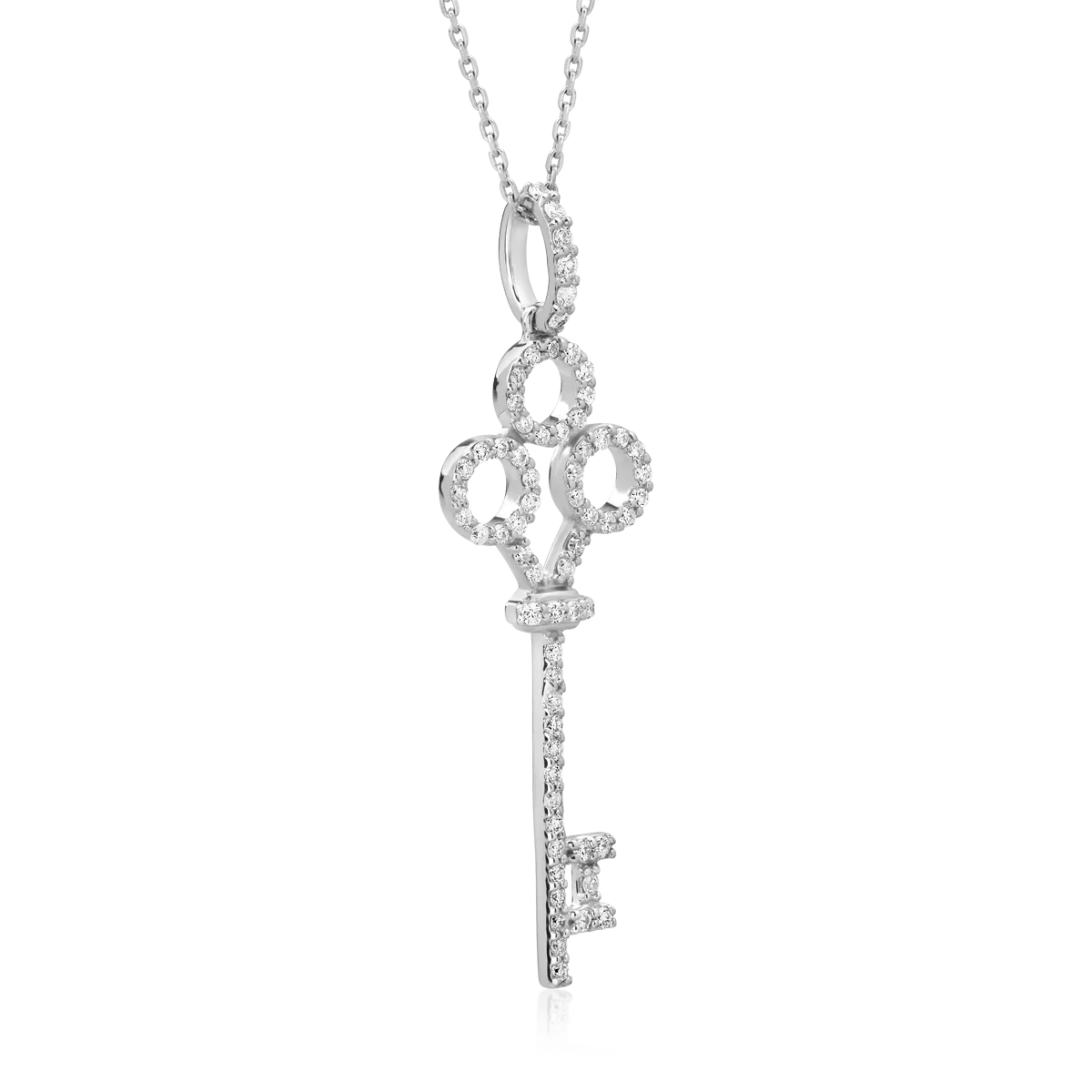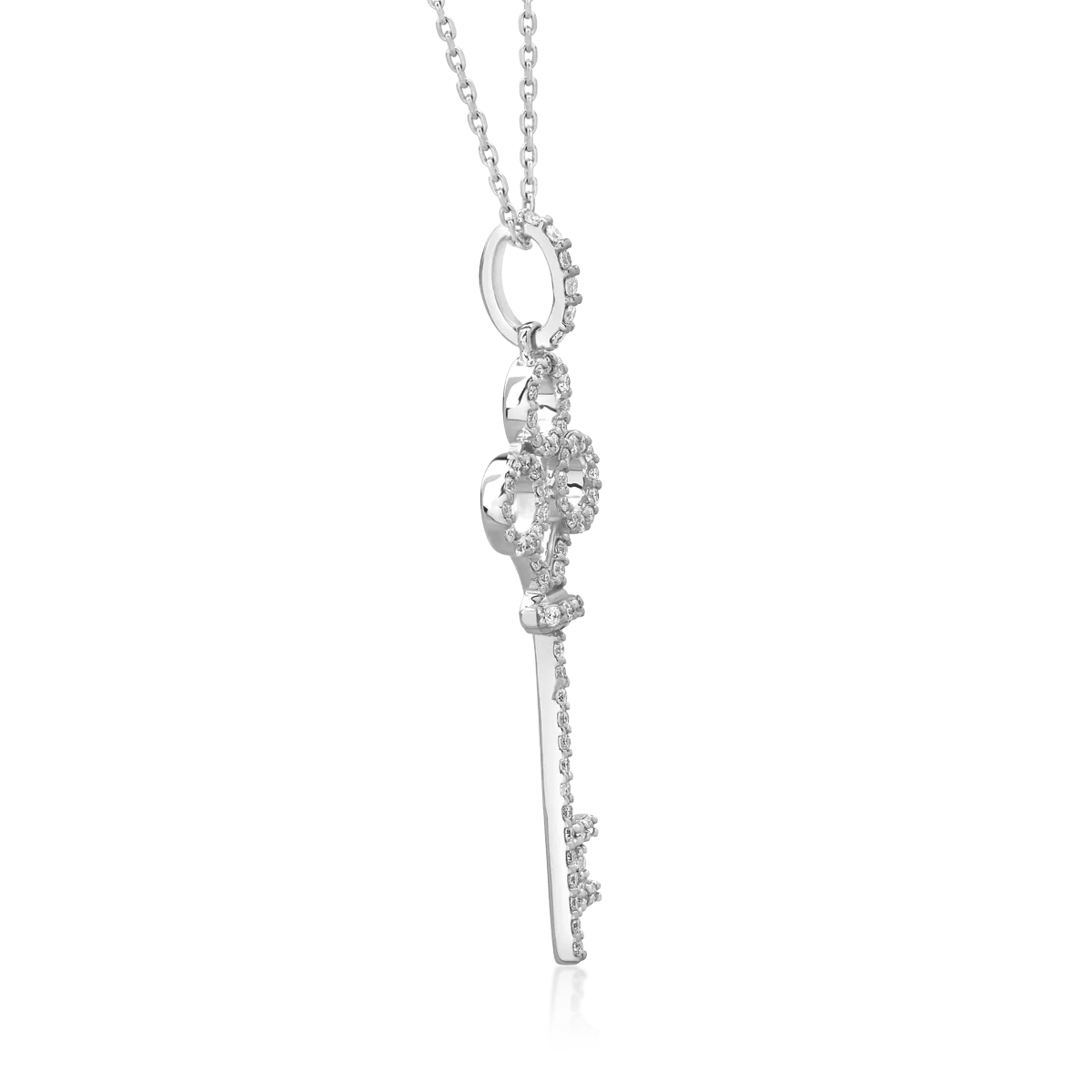 Alege să îți exprimi eleganța și rafinamentul cu acest lanț cu pandantiv cheie din aur alb, înfrumusețat cu diamante de 0.18ct. Designul său delicat oferă un farmec misterios, iar strălucirea diamantelor captează lumina interioară a celui care îl poartă. Această piesă cu semnificație este ideală pentru femeia care apreciază echilibrul subtil dintre putere și grație.