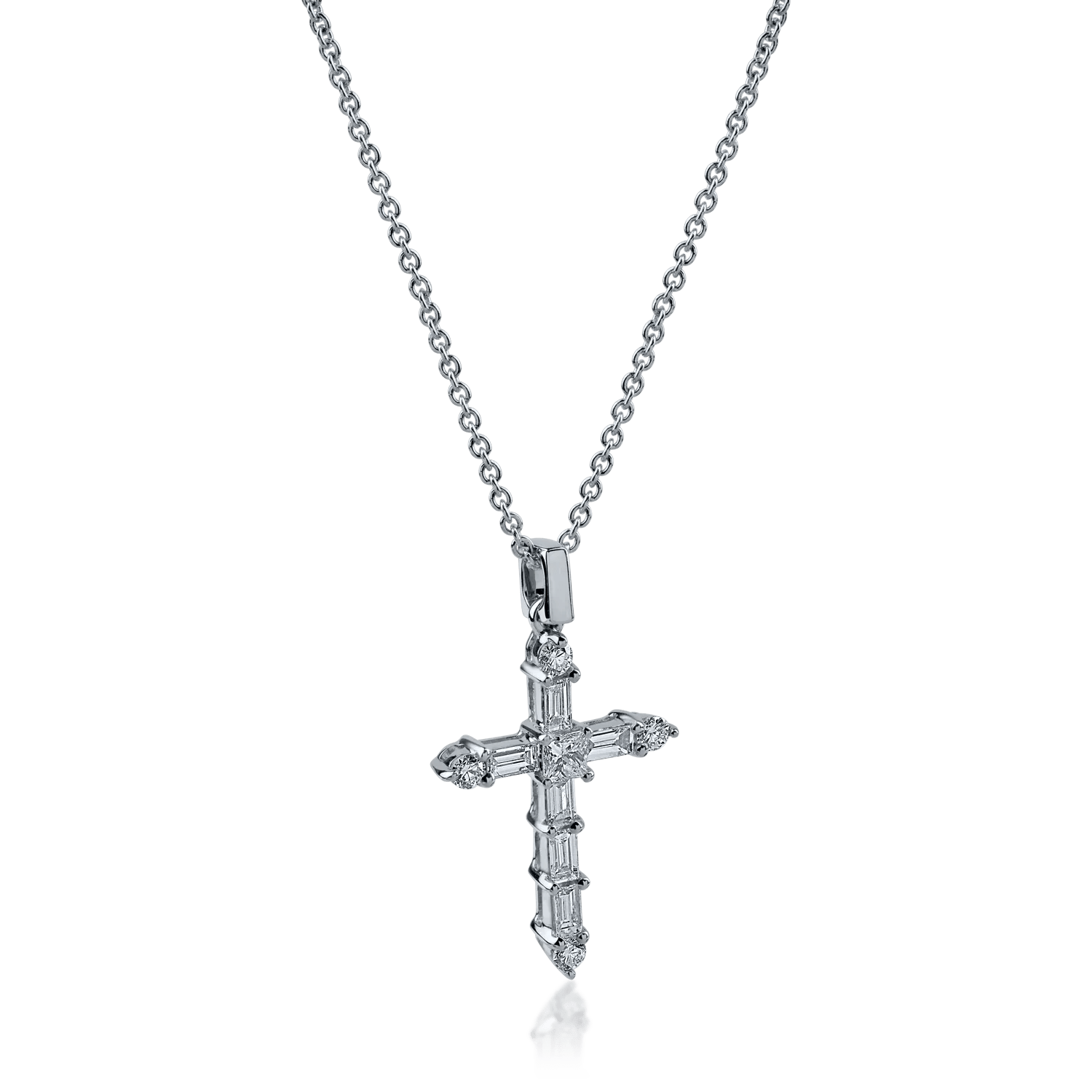Un lanț elegant cu pandantiv cruce din aur alb, decorat cu diamante în tăieturi baguette, princess și rotunde, totalizând 0.44ct. Designul modern oferă un joc rafinat de reflexii, ideal pentru a completa orice ansamblu vestimentar, fie că este zilnic sau pentru ocazii speciale.