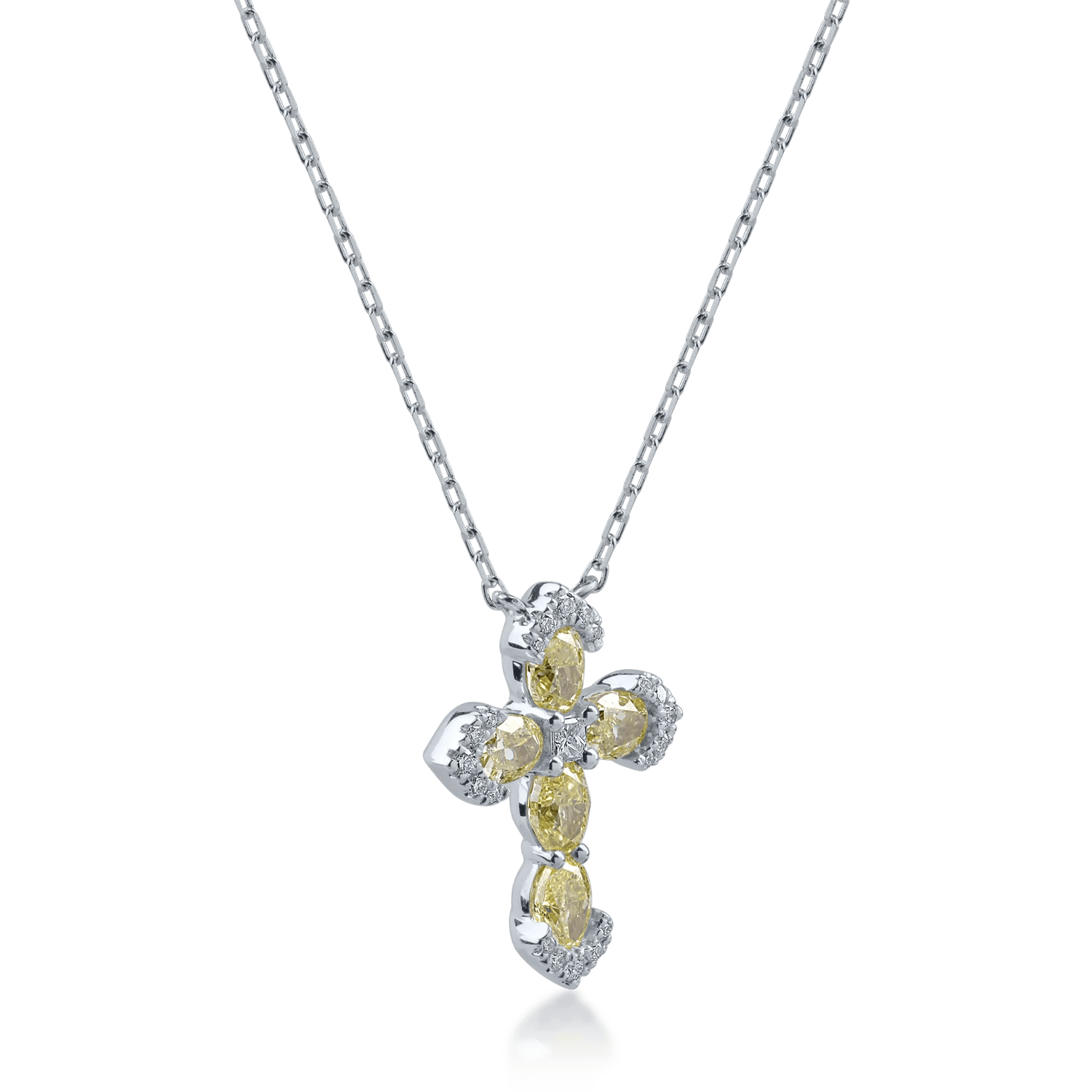 Lanţ cu pandantiv cruce din aur alb, cu diamante galbene ovale 1.25ct şi diamante incolore princess şi rotunde 0.13ct