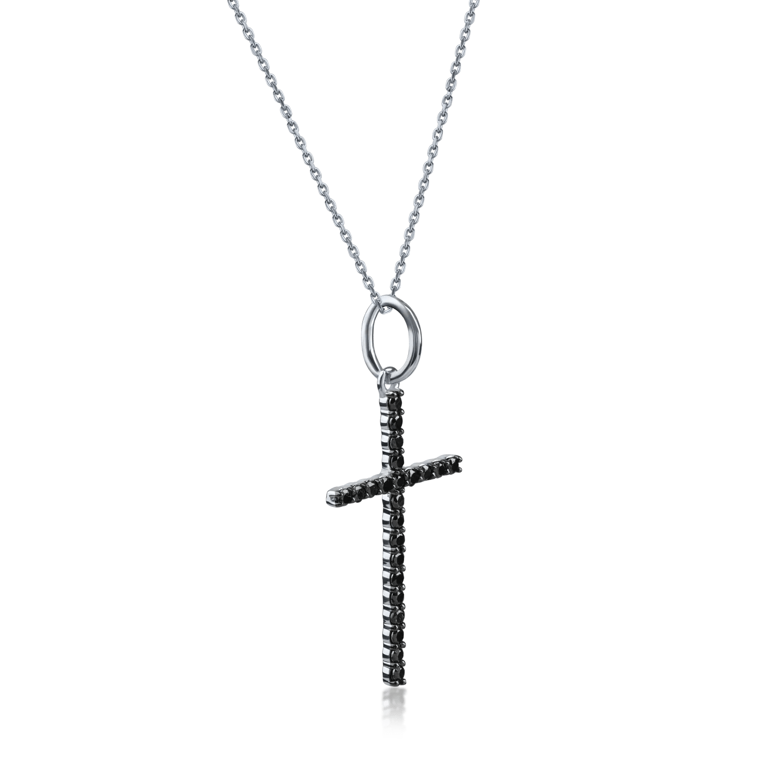 Lanțul elegant cu pandantiv cruce din aur alb și diamante negre de 0.4ct este ideal pentru femeia care iubește rafinamentul. Diamantele negre, atent șlefuite, captează lumina cu o strălucire misterioasă, conferind o notă modernă și sofisticată. Aurul alb pune în evidență designul simbolic al pandantivului.