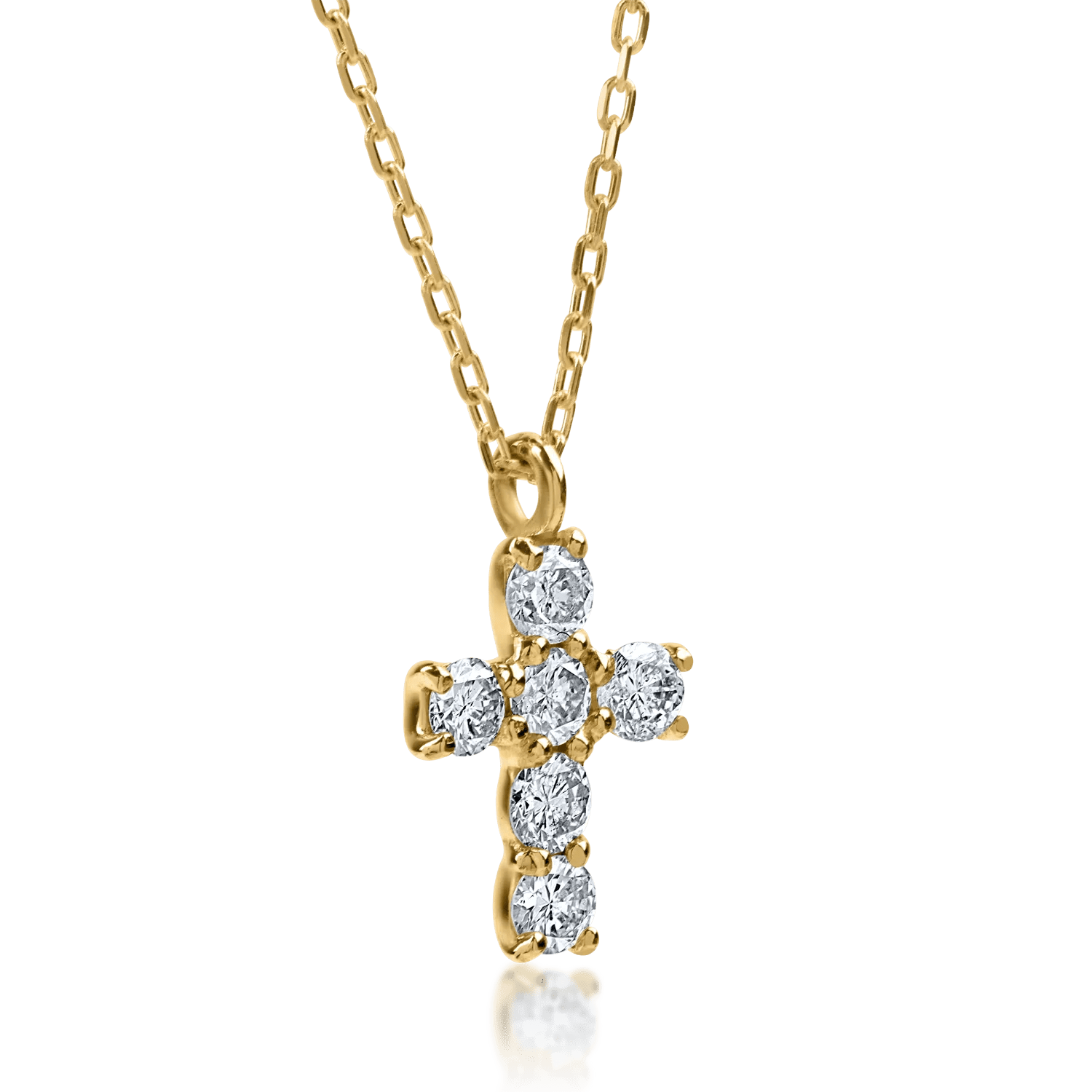 Acest lanţ cu pandantiv cruce din aur galben, înfrumuseţat cu diamante de 0.1ct, îmbină tradiţia simbolului cu un design contemporan. Diamantele alese reflectă lumina cu o claritate deosebită, în timp ce aurul galben adaugă caldură şi adâncime piesei.