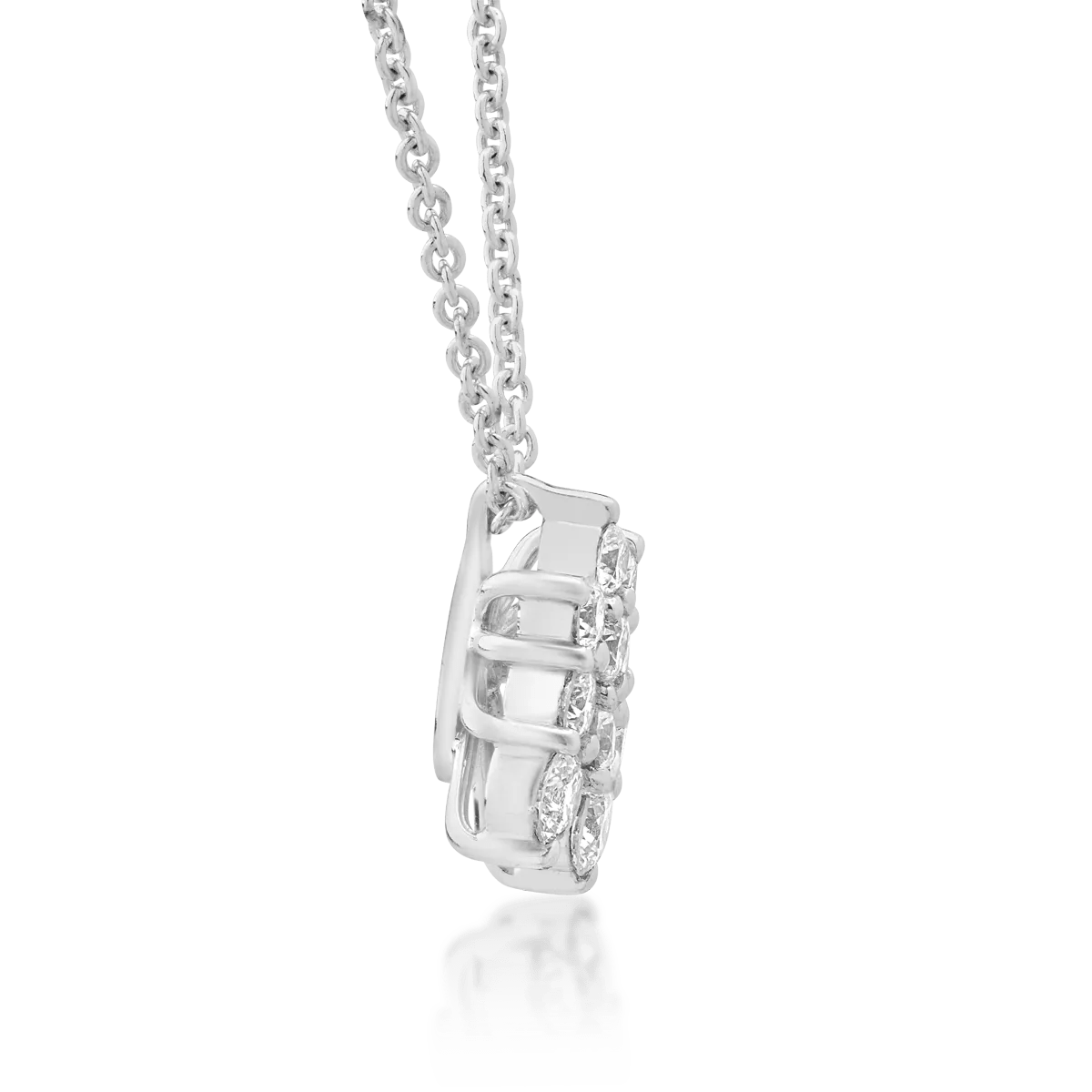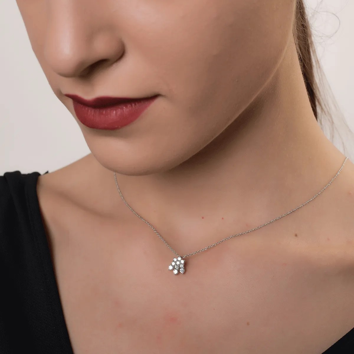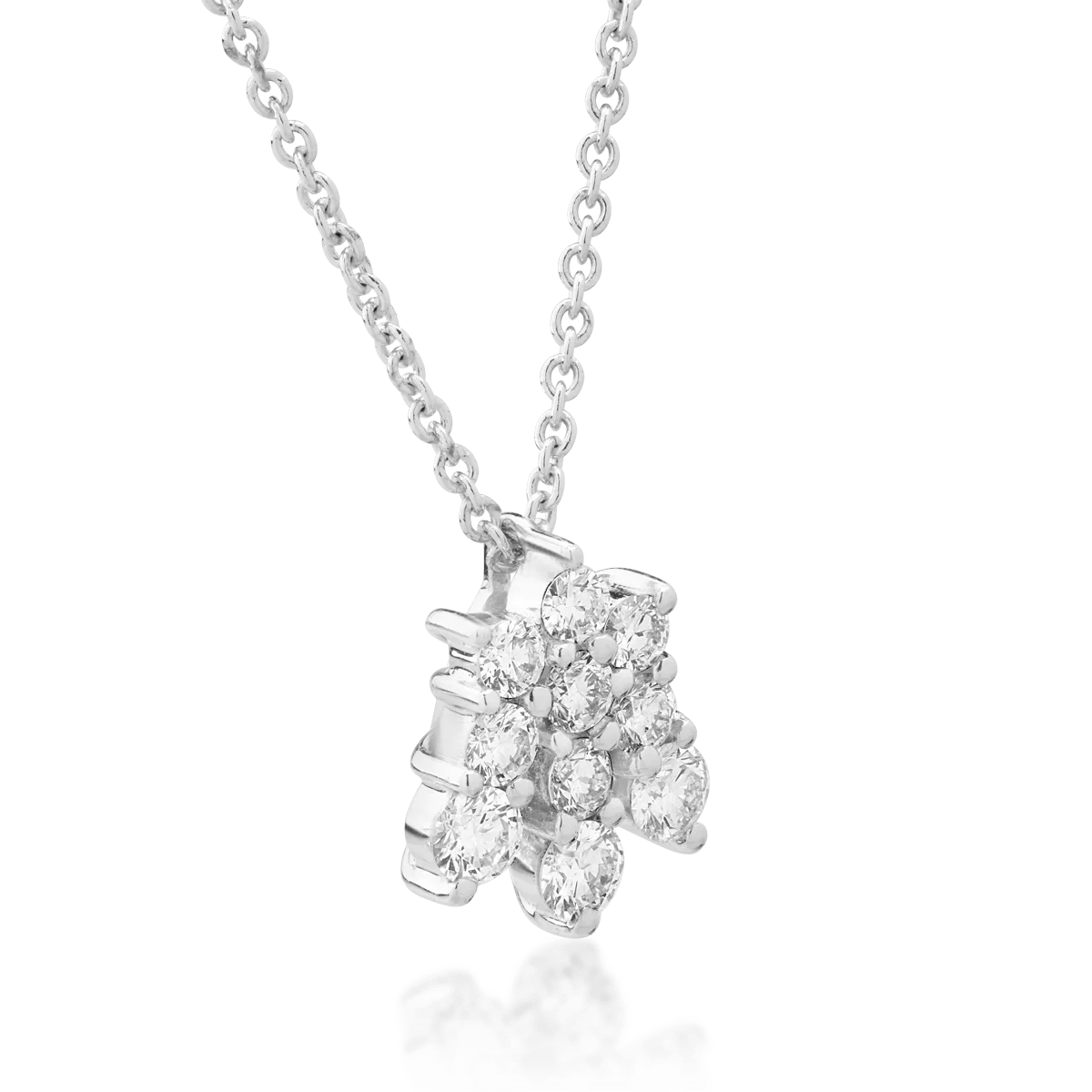 Acest lanț cu pandantiv din aur alb cu diamante de 0.46ct este un simbol al echilibrului între simplitate și rafinament. Strălucirea naturală a pietrelor se îmbină armonios cu tonurile delicate ale aurului, rezultând o frumusețe sofisticată.