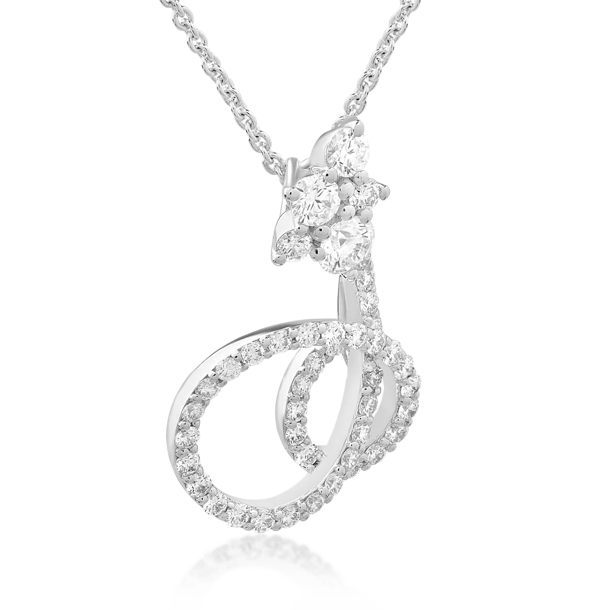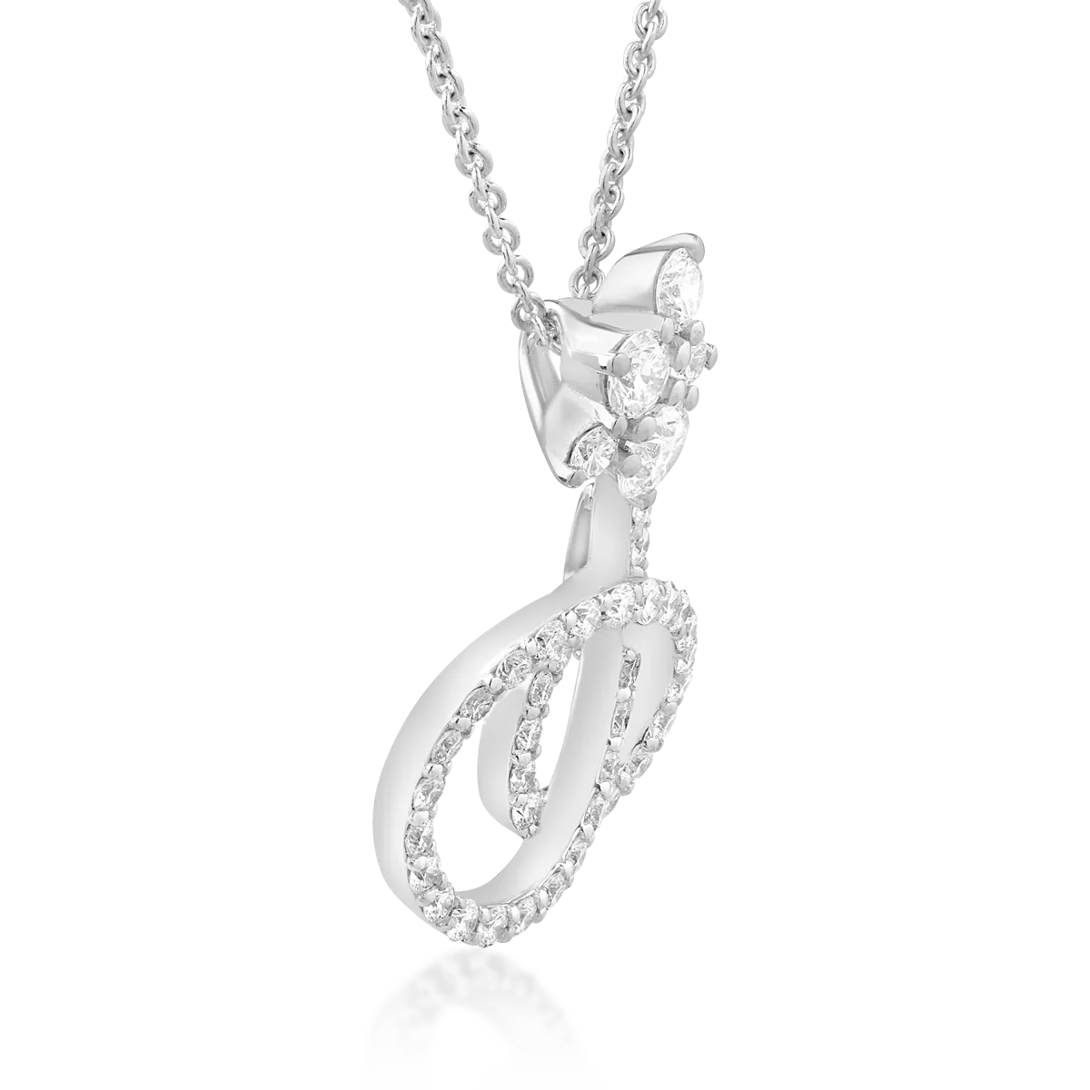 Lanțul cu pandantiv realizat din aur alb este accentuat de diamante de 0.75ct, aducând un plus de eleganță și stil oricărei ținute. Diamantele, cu tăieturi meticuloase, reflectă uluitor lumina, evidențiind designul rafinat și contemporan al bijuteriei. Această piesă este perfectă pentru femeile care prețuiesc frumusețea autentică.
