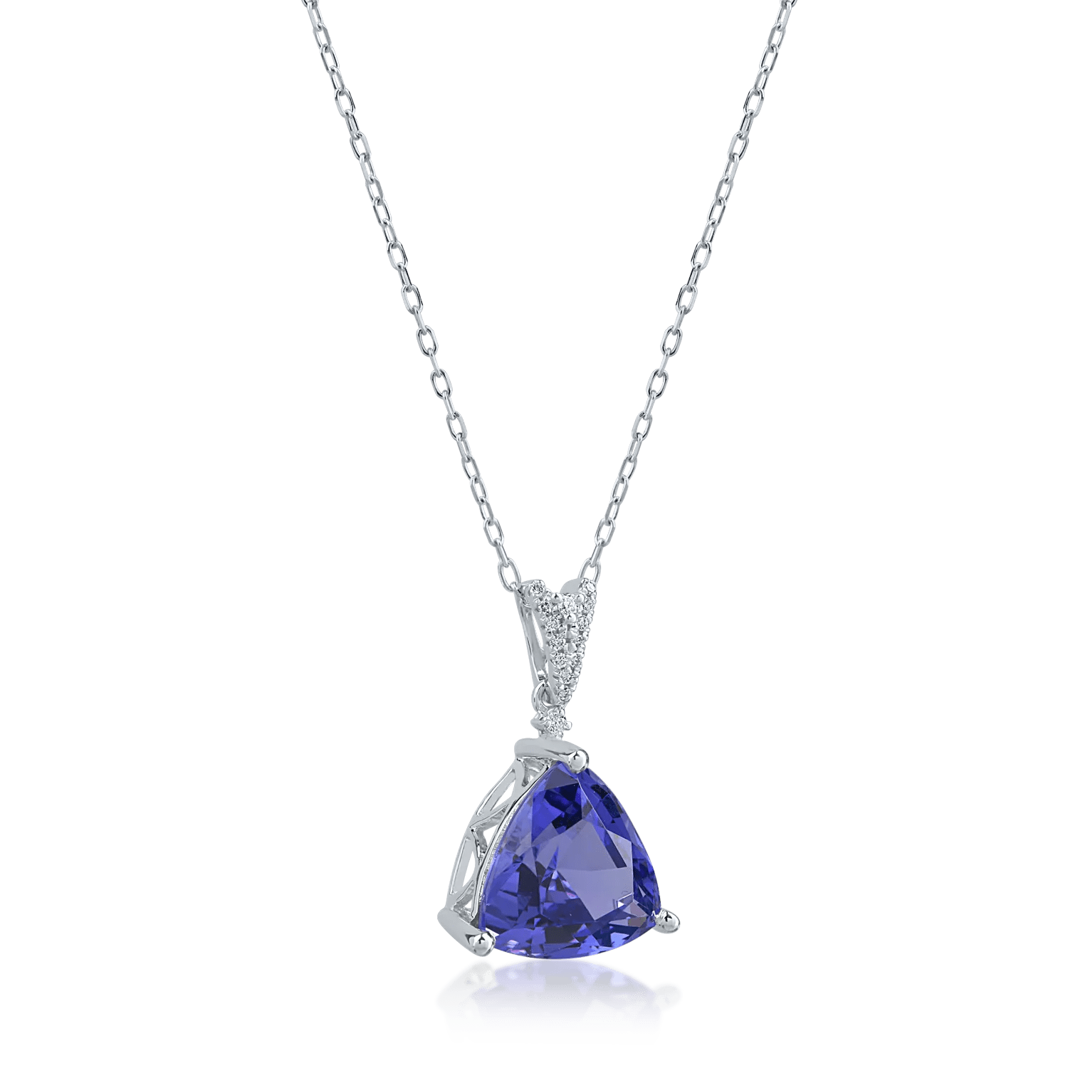 Acest lanț cu pandantiv, realizat din aur alb, prezintă un tanzanit de 4.46ct, tăiat în formă de trillion, ce radiază nuanțe profunde de albastru și violet. Diamantele de 0.05ct completează elegant designul, oferind un accent subtil și strălucitor. Ideal pentru femeile care apreciază o combinație de forță și rafinament.