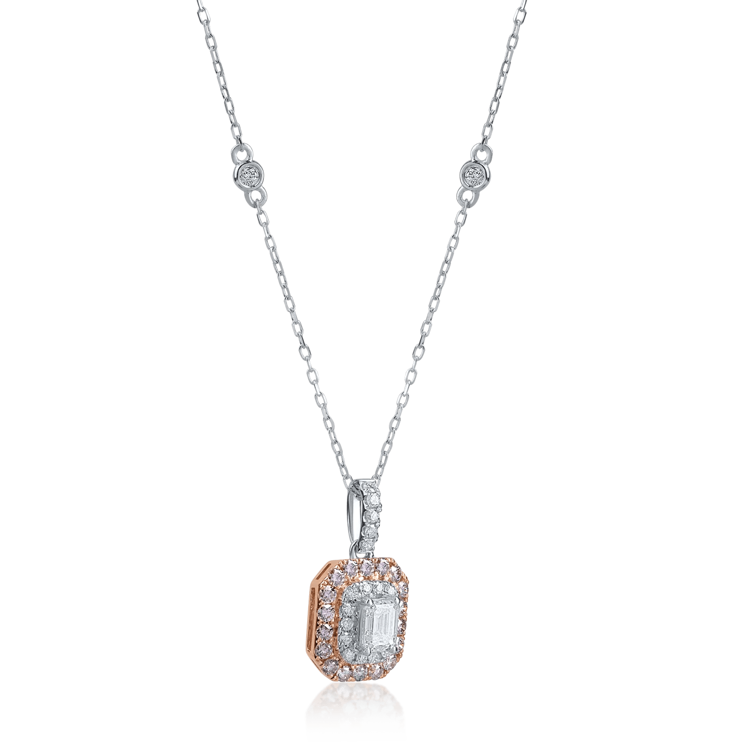 Fiecare moment petrecut purtând bijuterii care te definesc este special. Lanțul cu pandantiv din aur alb-roz, însoțit de diamante roz emerald și rotunde de 0.7ct, precum și de diamante transparente de 0.18ct, reflectă frumusețea ta. Taietura emerald pune în evidență claritatea pietrelor, iar nuanțele de roz aduc o notă caldă și rafinată, perfectă pentru femeile care doresc să strălucească prin detalii fine.