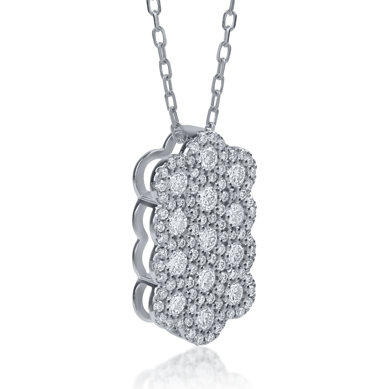 Adaugă o notă de strălucire cu acest lanț din aur alb, decorat cu diamante de 0.79ct. Designul său rafinat și detaliile meticuloase aduc în prim-plan reflexii impecabile, accentuând eleganța metalului prețios. O bijuterie ce îmbină modernul cu clasicul, potrivită pentru orice ținută.