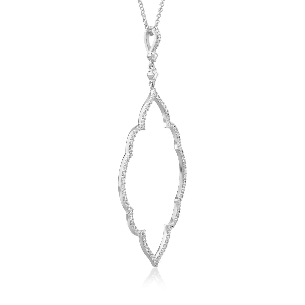 Acest lanț cu pandantiv din aur alb cu diamante de 1.27ct reflectă eleganța și forța interioară. Diamantele, meticulos tăiate, creează un joc de lumină subtil și captivant. Montura din aur alb oferă puritate și rafinament, transformându-l într-o bijuterie ideală pentru orice ocazie. O combinație armonioasă de tradiție și modernitate, specifică bijuteriilor TEILOR.