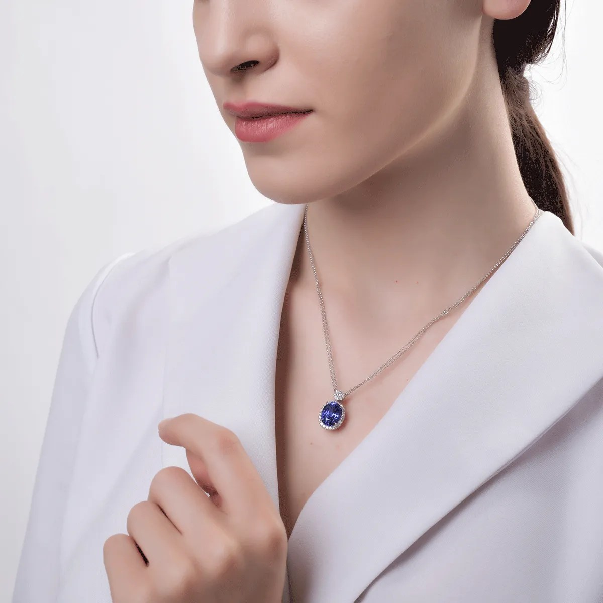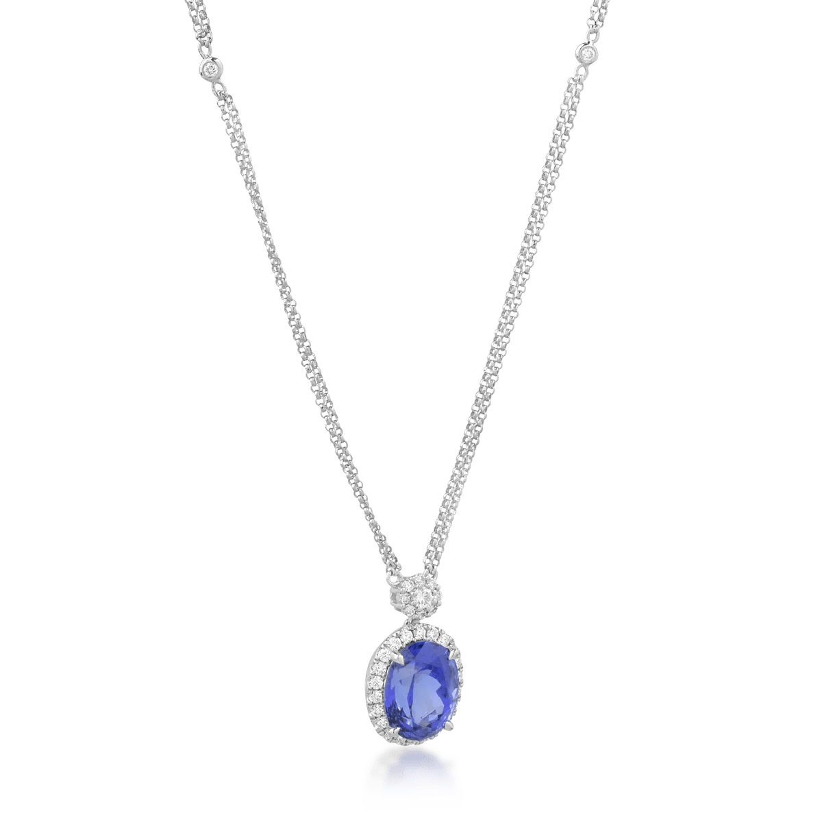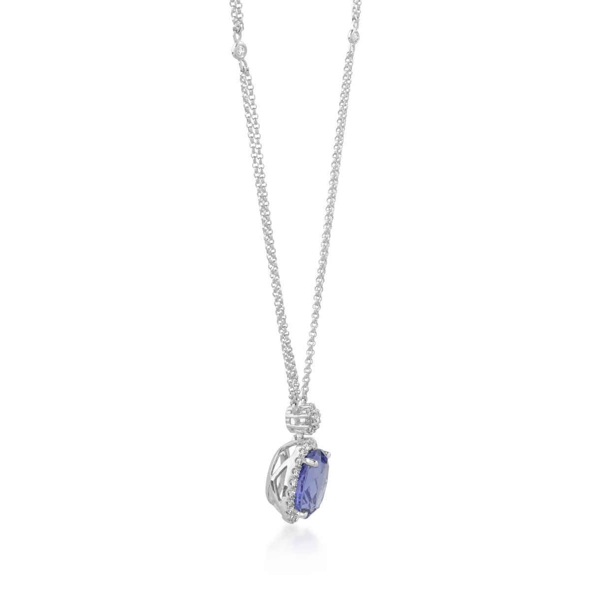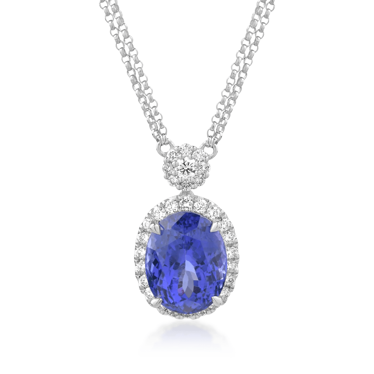 Descoperă eleganța acestui lanț cu pandantiv din aur alb, ce îmbină un tanzanit oval de 6.04ct cu diamante de 0.58ct.