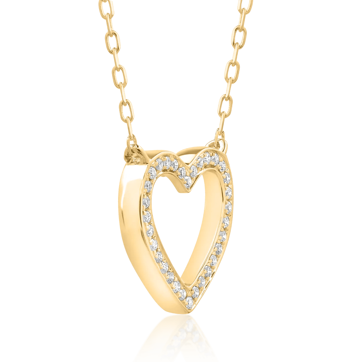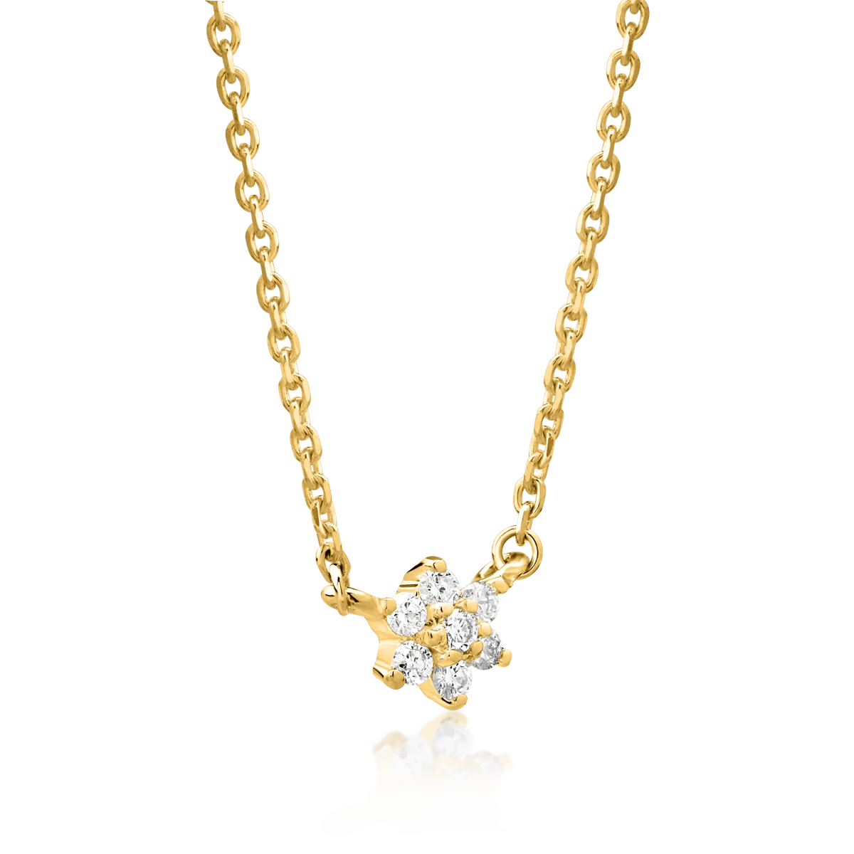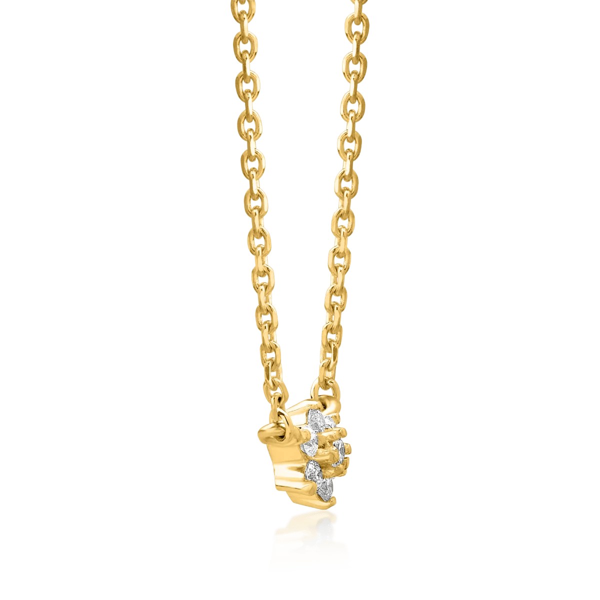Acest lanț cu pandantiv din aur galben încorporează diamante de 0.08ct, oferind un accent rafinat ținutelor elegante. Designul său atrage privirile datorită strălucirii subtile a diamantelor care îmbină nuanța caldă a aurului.