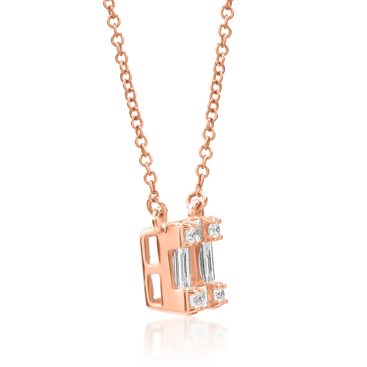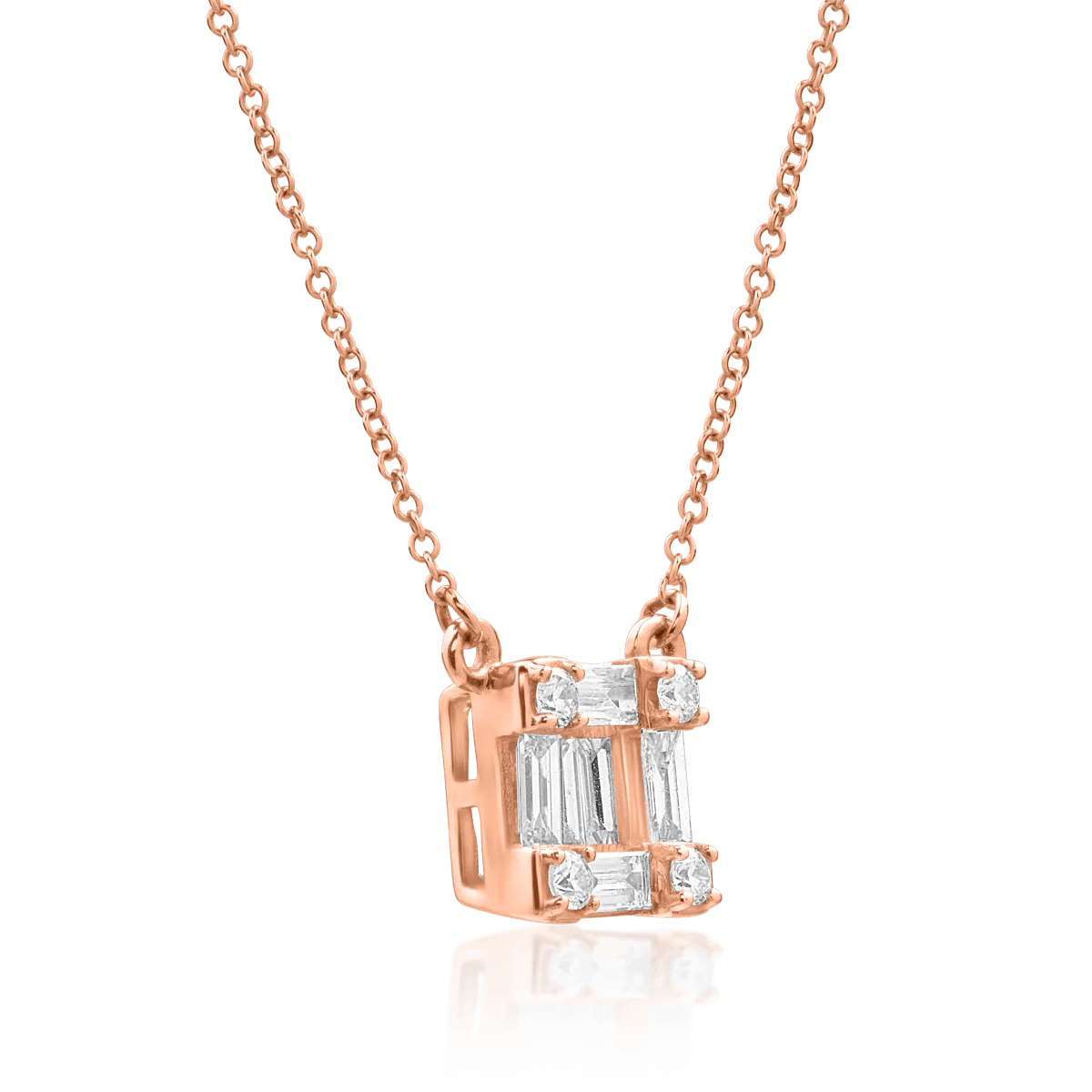 Descoperă farmecul talismanului tău personal. Acest lănţ cu pandantiv din aur roz este decorat cu diamante baguette şi rotunde de 0.268ct, oferind un aspect rafinat şi modern. Strălucirea tăieturilor baguette se îmbină armonios cu rafinamentul pietrelor rotunde, creând un echilibru de eleganţă contemporană şi detalii clasice, perfect pentru femeile ce apreciază frumuseţea autentică.