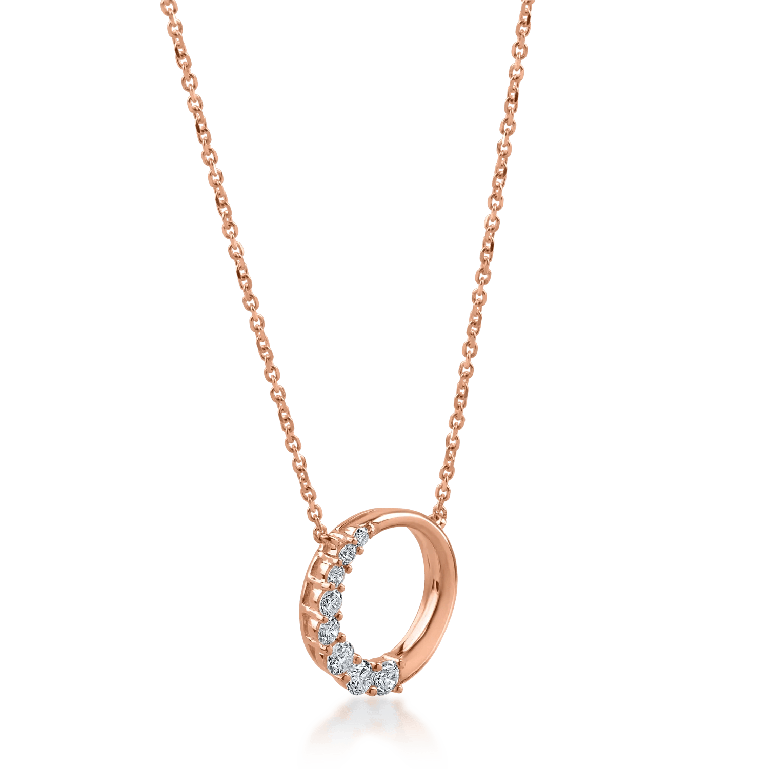 Acest lanț cu pandantiv din aur roz și diamante de 0.19ct oferă un echilibru armonios între strălucirea metalului și sclipirea delicată a pietrelor. Designul său rafinat adaugă o notă subtilă de eleganță stilului tău, fiind potrivit pentru orice ocazie. Descoperă rafinamentul bijuteriilor TEILOR.
